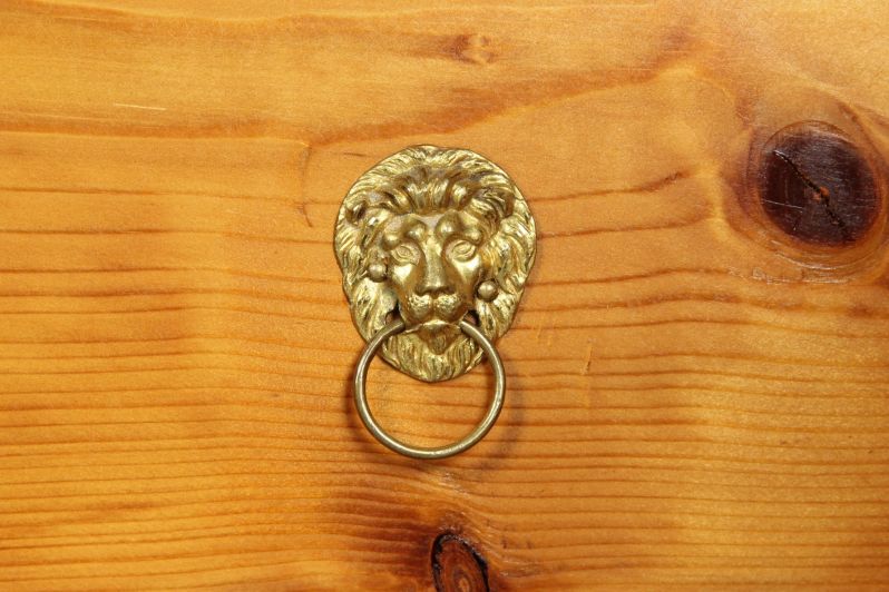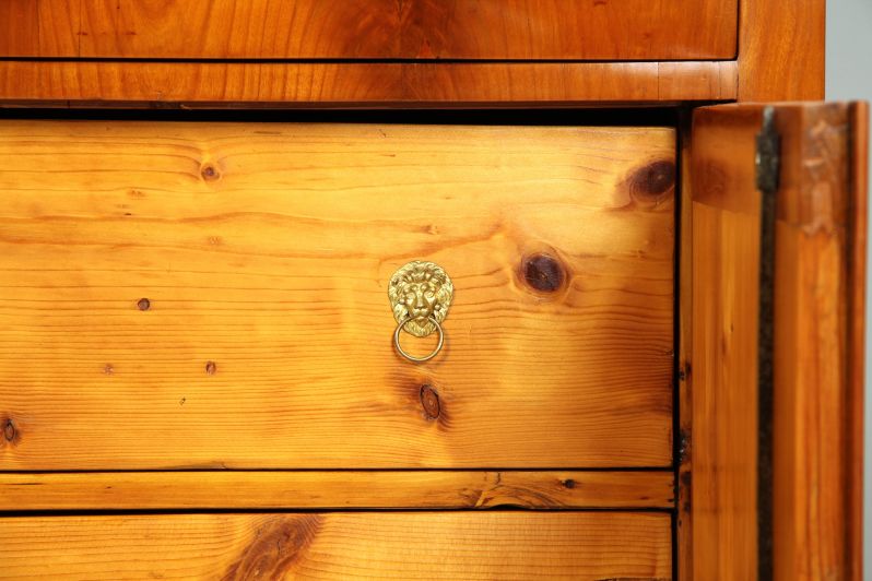 La répartition intérieure du meuble est également inhabituelle. Ainsi, derrière les portes verrouillables au moyen d'une serrure à barre, nous trouvons trois tiroirs au lieu de l'étagère habituelle. Des têtes de lion dorées et estampées en laiton servent de poignées de tirage pour les tiroirs.