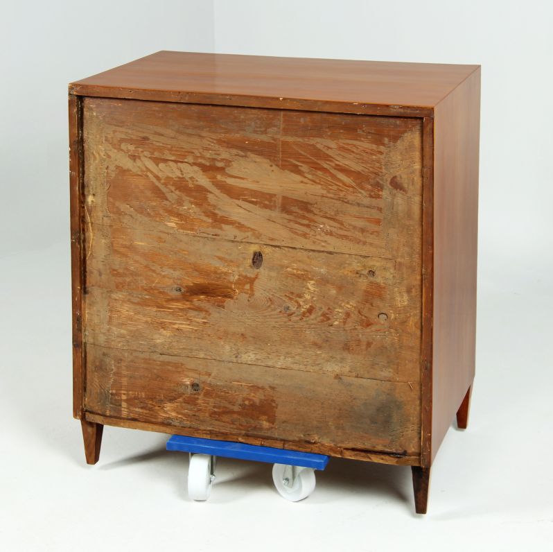 Si nous observons les côtés et le plateau supérieur du meuble, nous remarquons que le placage a été réalisé sur toute la longueur. Le veinage s'étend donc du côté gauche jusqu'au côté droit en passant par le panneau supérieur. Pour souligner ce travail de placage exceptionnel, on a renoncé à une saillie du panneau. Le bord du panneau est simplement indiqué par une fine ligne déchirée.