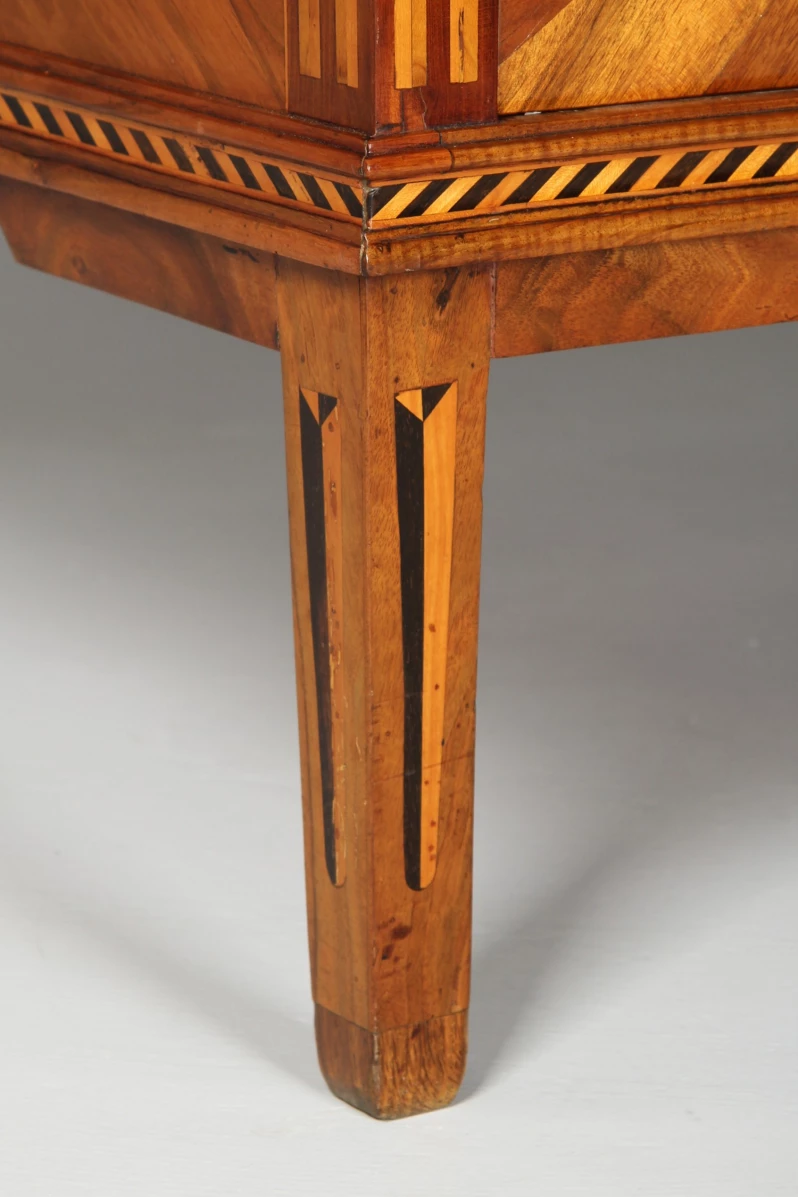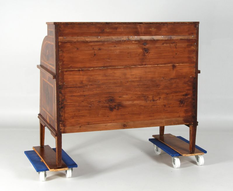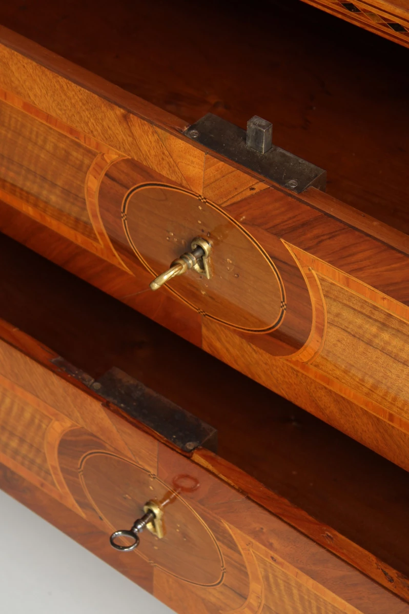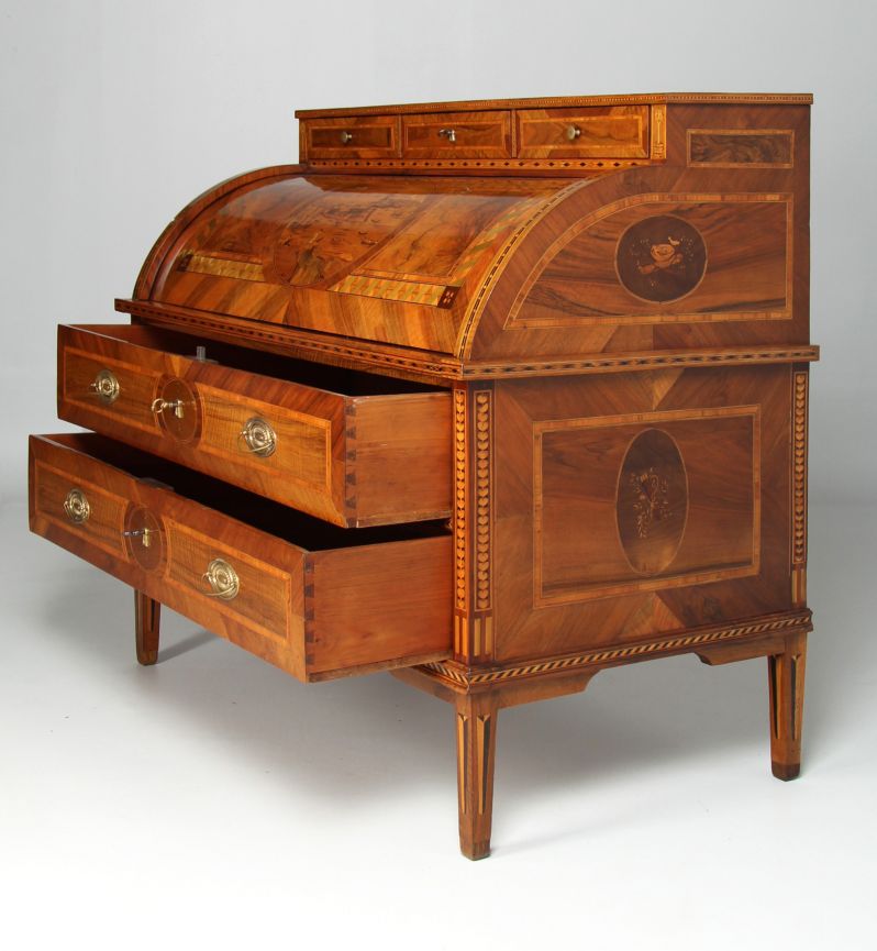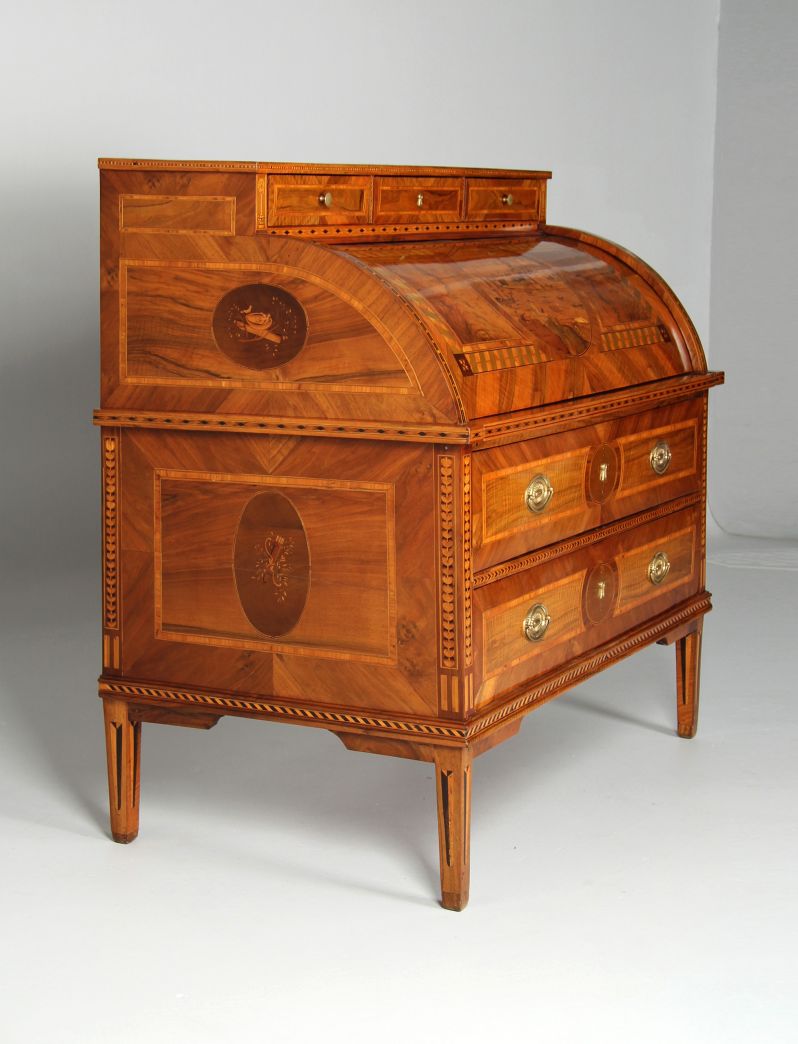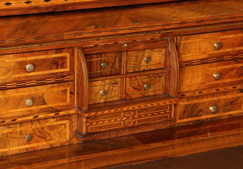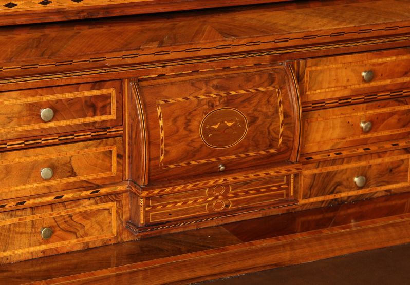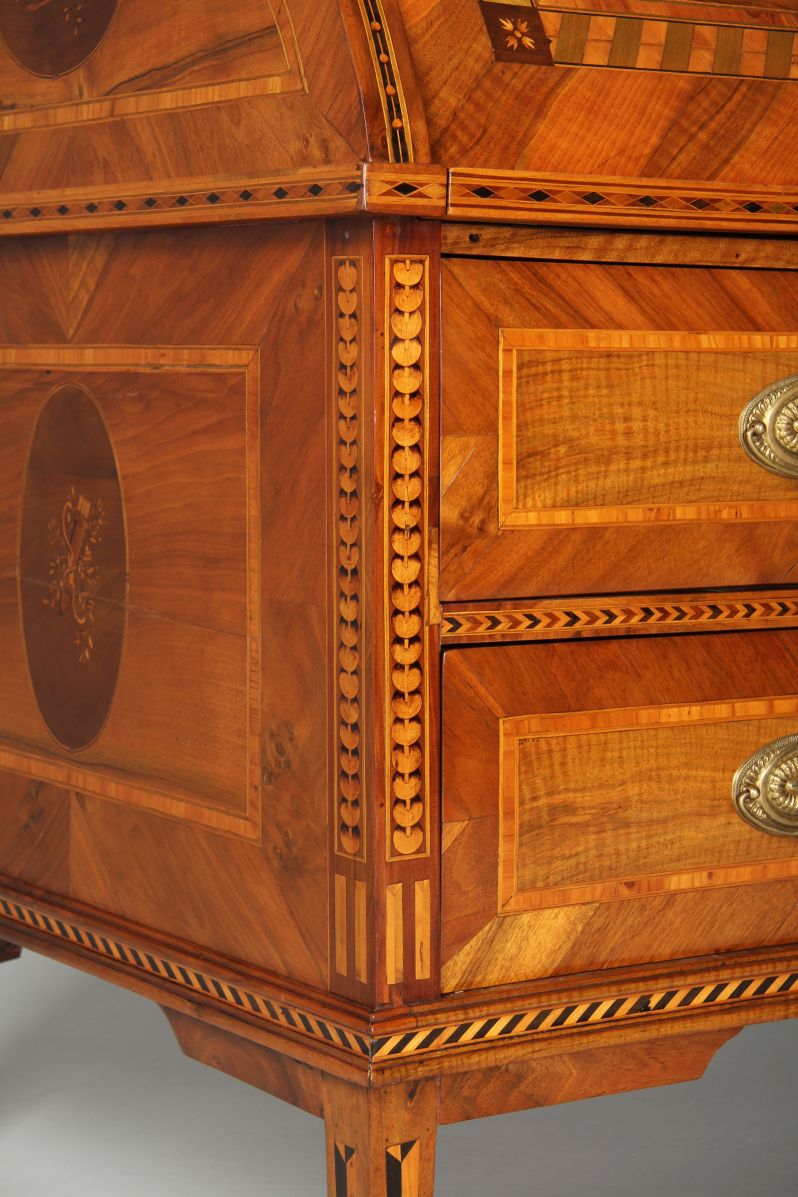 L’élément principal est le cylindre quart-de-rond. Son décor d’incrustations impressionne non seulement par la finesse et la multitude de pièces de bois ajustées, mais aussi parce que cette forme et cette richesse demeurent extrêmement rares.