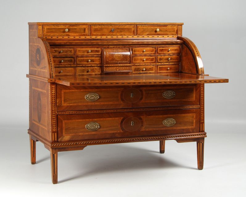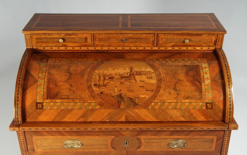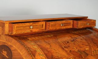 L’ouverture du cylindre révèle un vaste espace d’écriture avec huit tiroirs, quatre faux-tiroirs et un compartiment central à rideau, dissimulant encore quatre petits tiroirs. Ici, protégé de la lumière, l’originale teinte verte, très bien conservée, donne une idée de la polychromie saturée qui ornait autrefois le meuble entier. De riches incrustations géométriques dominent également le compartiment. Même la tranche inférieure du cylindre est ornée d’une frise contrastée clair-sombre – témoignage d’un amour exceptionnel du détail.
