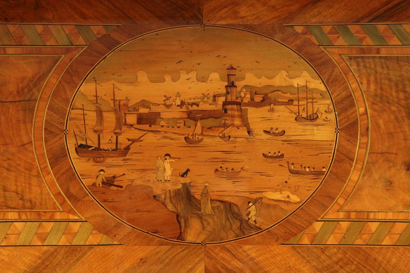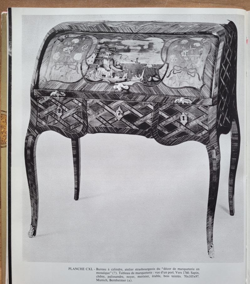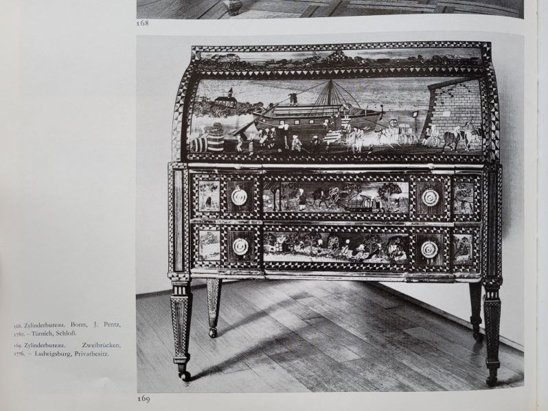 La scène portuaire d’aspect néerlandais peut être liée au mariage des destinataires ; d’autres meubles à décor maritime de la région sont attestés, par exemple un secrétaire à cylindre de 1776 provenant de Deux-Ponts (voir Kreisel/Himmelheber, Die Kunst des deutschen Möbels III, fig. 169), ou encore un bureau à cylindre réalisé à Strasbourg vers 1760 (voir Françoise Léwy-Coblentz, L’Art du Meuble en Alsace, pl. CXL, p. 330).