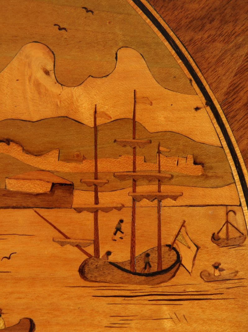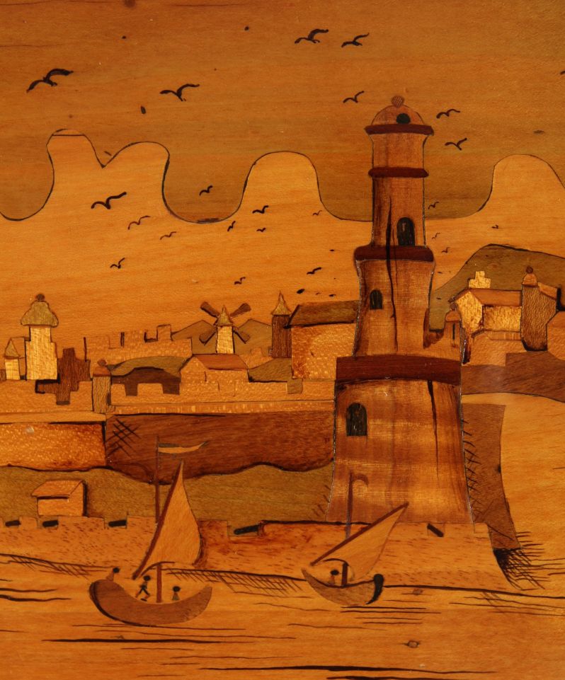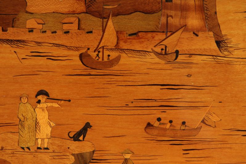 On y voit un paysage de fantaisie romantisé avec phare et quai devant une petite ville portuaire. Une staffage de figures au premier plan observe les manœuvres animées de voiliers grands et petits dans l’étroite baie ou embouchure de rivière. De fines gravures suggèrent le clapotis des vagues et rendent sensibles les textures de la voile et des étoffes. Les veines du bois utilisées de manière appropriée confèrent un effet tridimensionnel au relief du premier plan.
