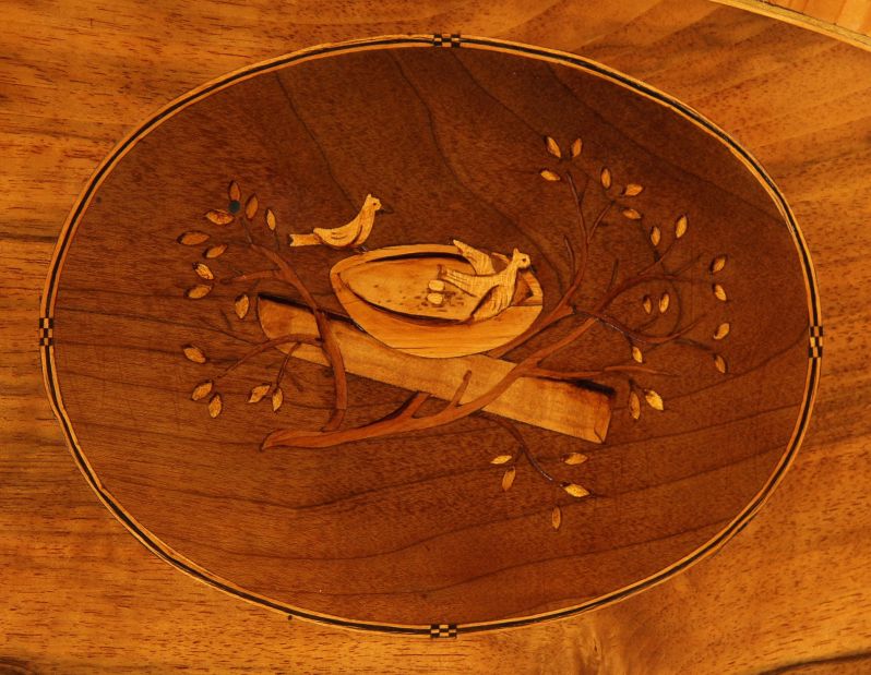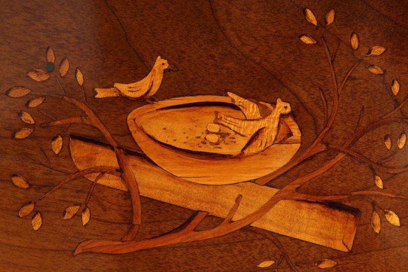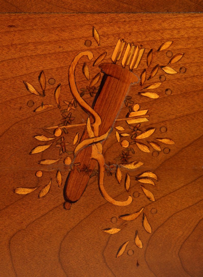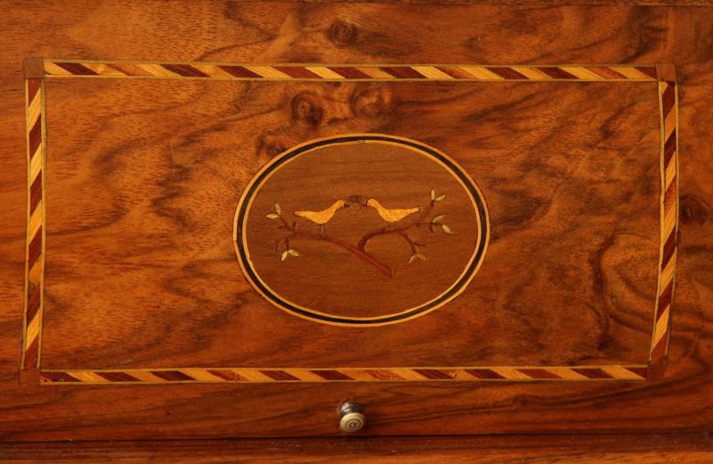 Deux colombes reliées par un anneau forment le motif central de marqueterie à l’intérieur, ce qui suggère que le secrétaire fut à l’origine offert en cadeau de mariage. Les incrustations symboliques sur les côtés vont dans le même sens.