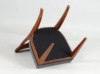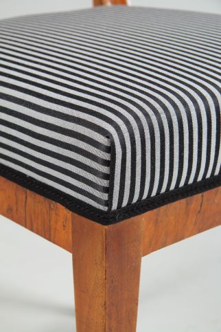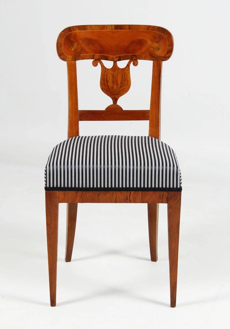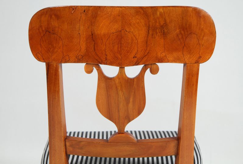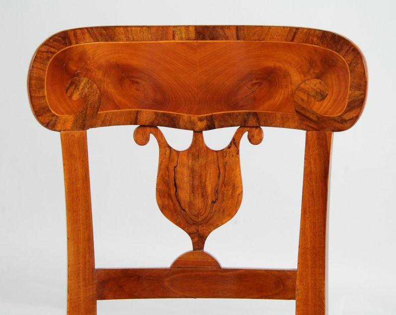 Pieds carrés droits et effilés à l'avant et pieds légèrement évasés à l'arrière. La planche de dossier arrondie rappelle la forme d'une chaise à pelle avec ses incrustations en noyer et en cerisier. L'élément décoratif en dessous est travaillé en forme de lyre.