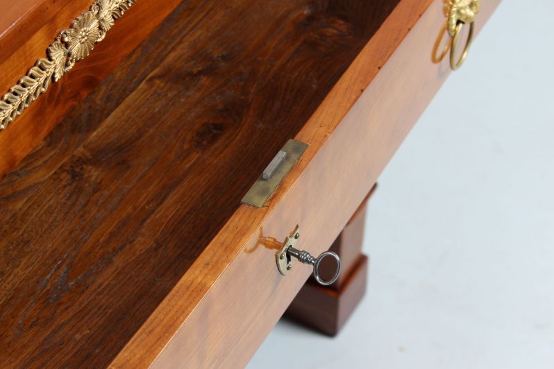 Remis en état pour une utilisation quotidienne et poli à la gomme-laque. Les tiroirs fonctionnent bien, la serrure fonctionne.
