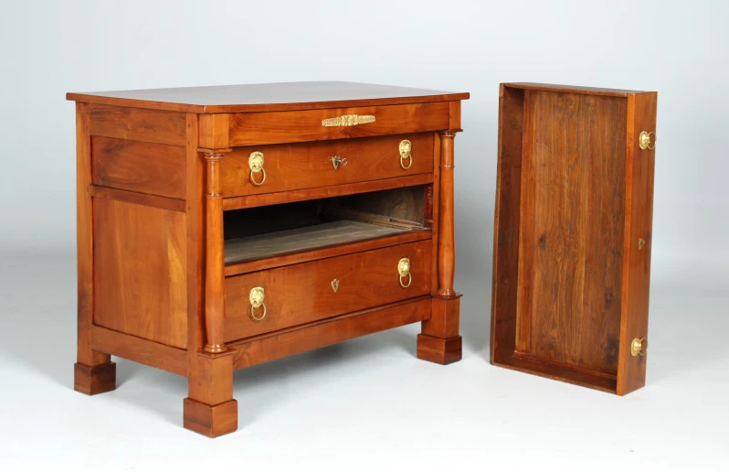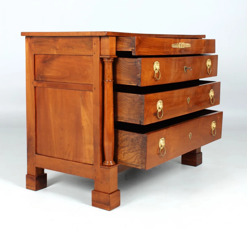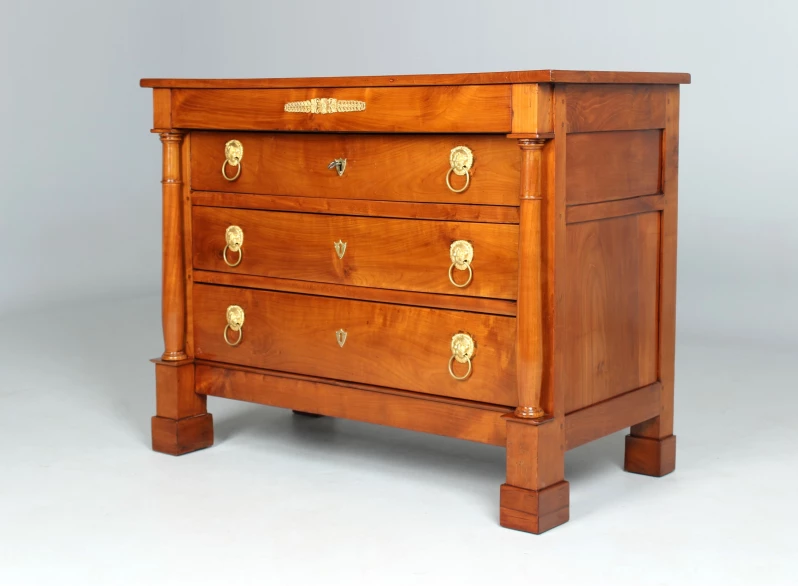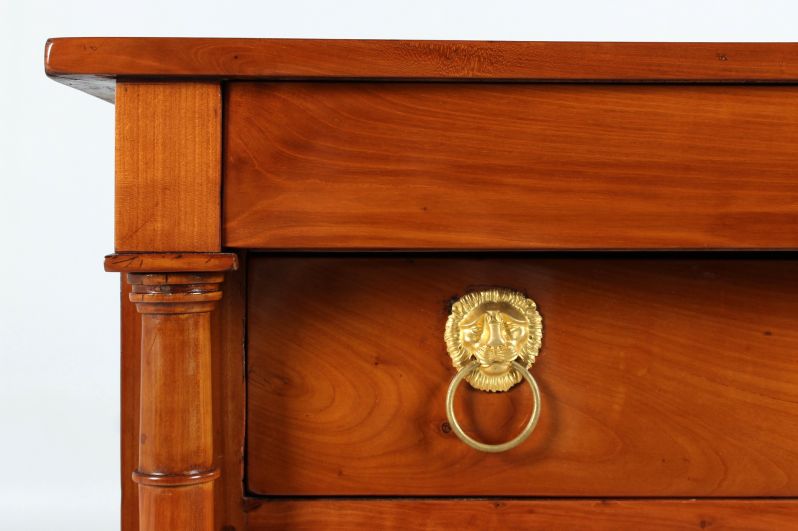 Les ferrures contrastent avec le bois - poignées en forme de têtes de lion, plaques de clé en forme d'armoiries et élément décoratif végétal sur le tiroir de tête.
