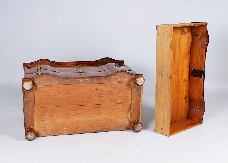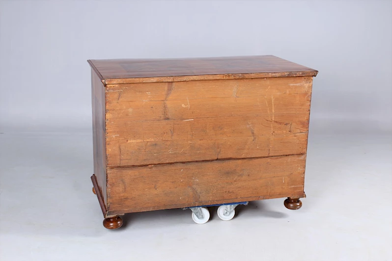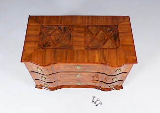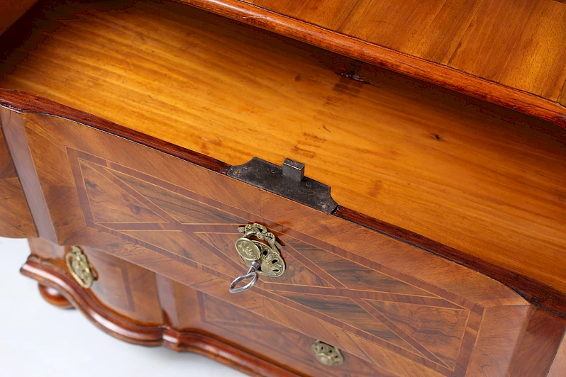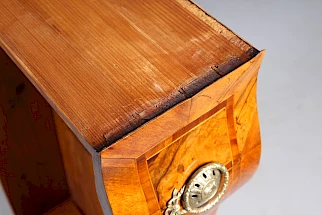 Le bord périphérique du plateau supérieur est plaqué de noyer à croissance rectiligne, la structure du bois correspond à celle de la façade et du côté de la commode. Dans les coins, le placage est posé en onglet, comme sur la façade et les côtés.