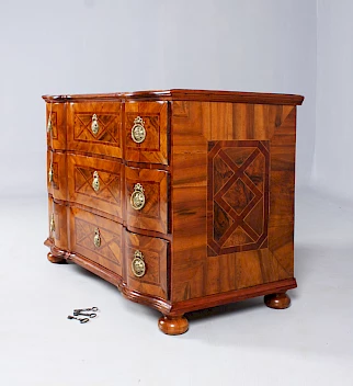 Commode baroque de rêve avec de belles proportions et un fantastique travail de marqueterie.