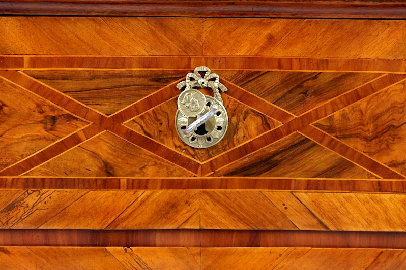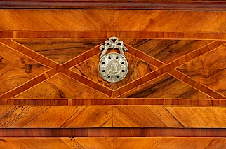 Les ferrures de style Louis XVI sont assorties aux marqueteries rectilignes, d'un classicisme certain.