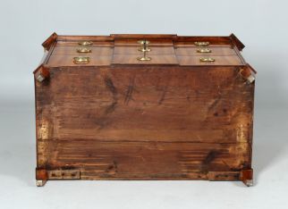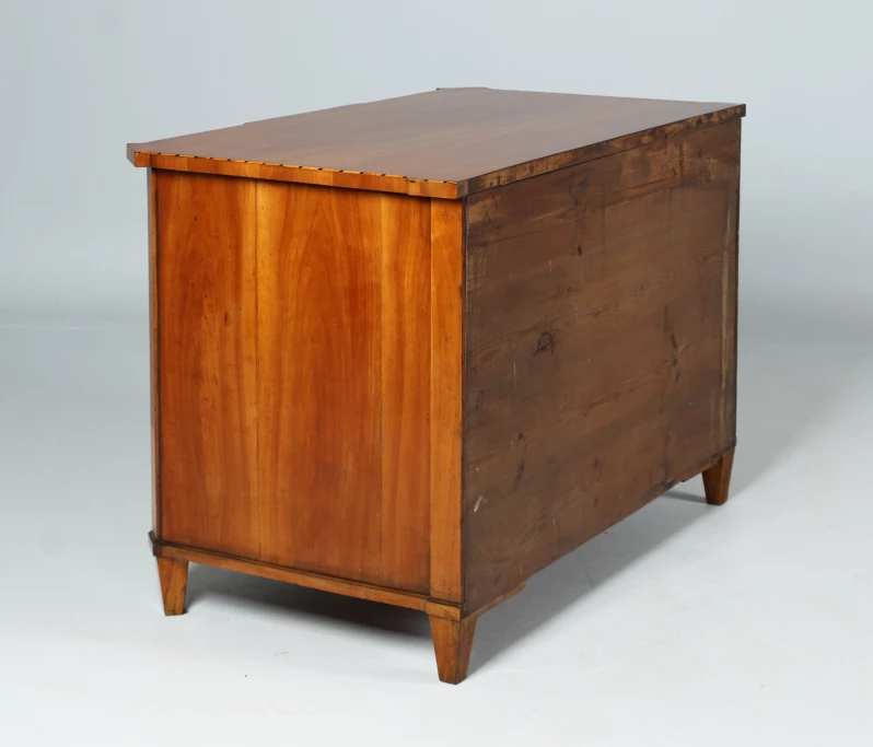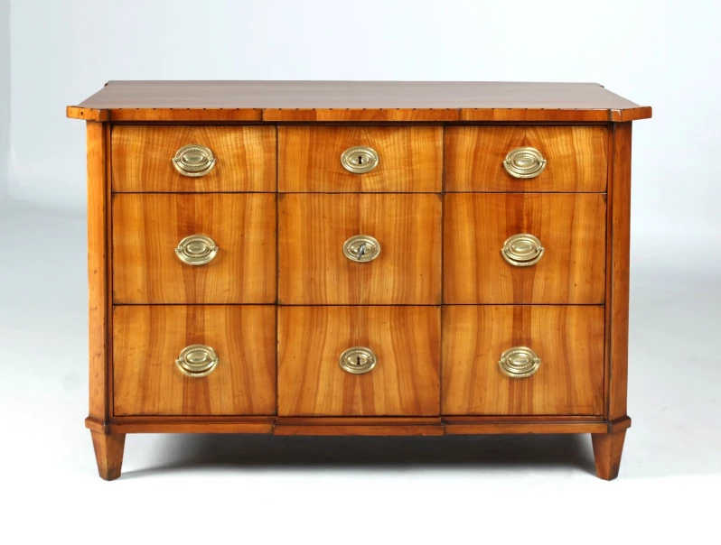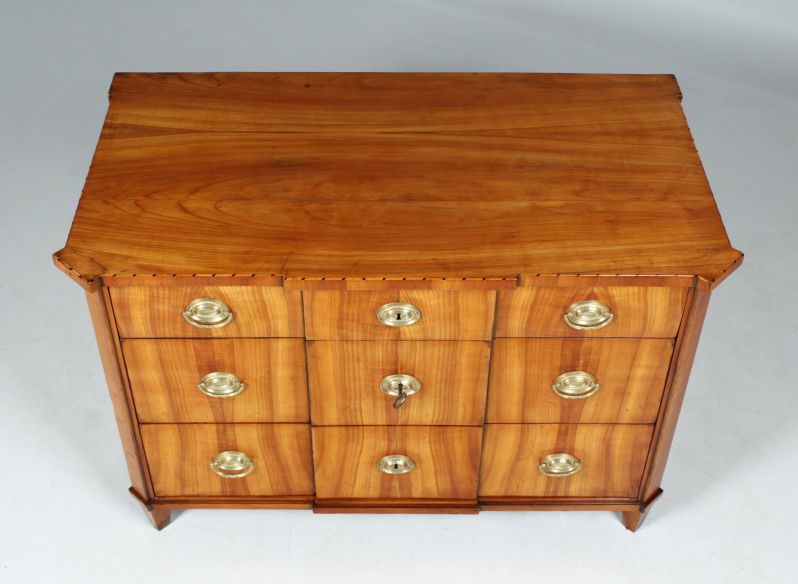 La partie centrale en saillie date clairement de l'époque classique, tout comme les ferrures originales dorées à chaud. De même, les pilastres de type risalit, les baguettes verticales correspondantes à l'arrière des côtés et les bandes de filets courant sur le bord du plateau parlent encore le langage de la fin du 18e siècle.