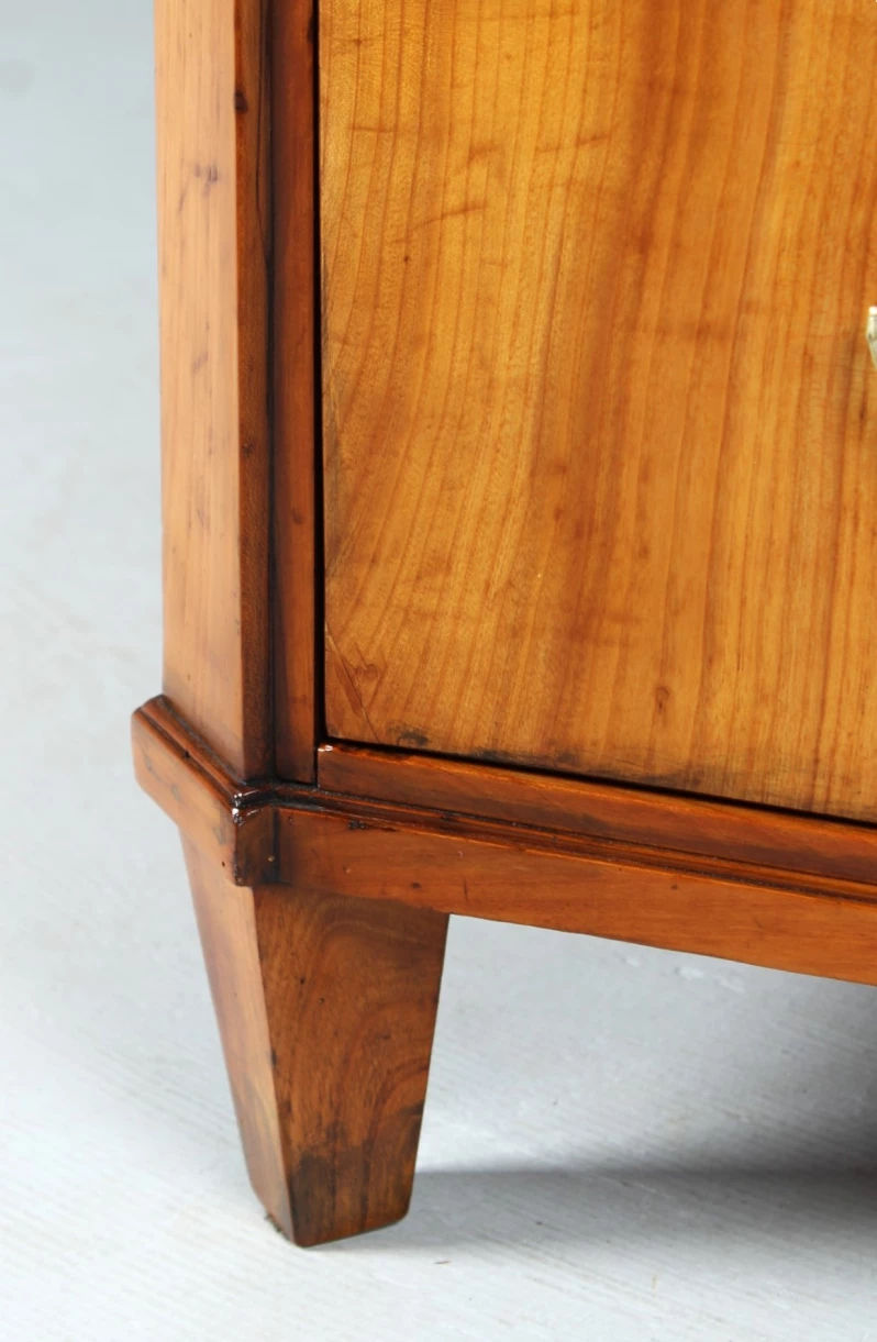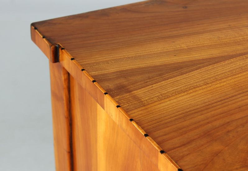 Meuble à trois corps reposant sur des pieds courts et pointus, avec des veines de cerisier nettes et continues.