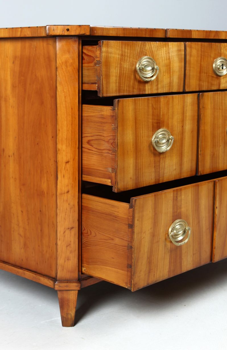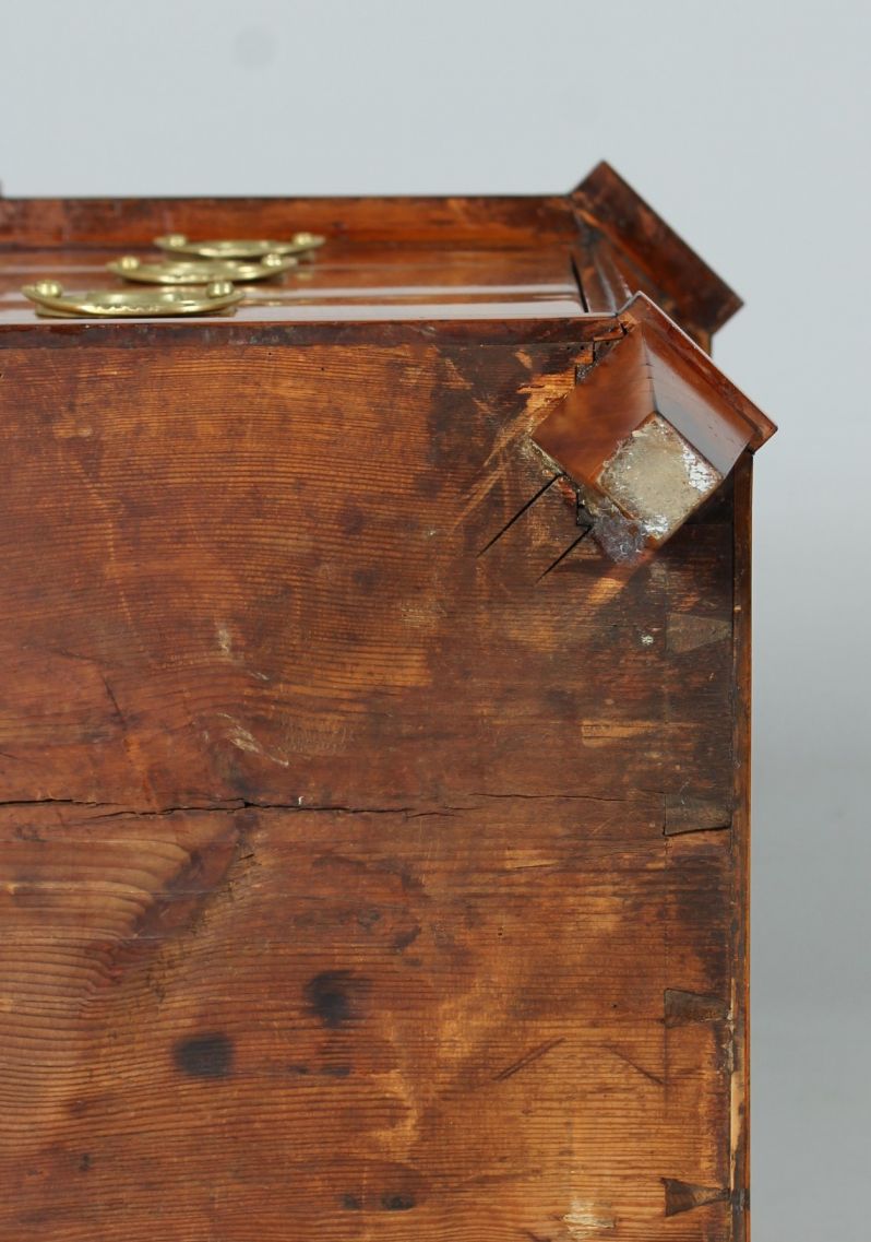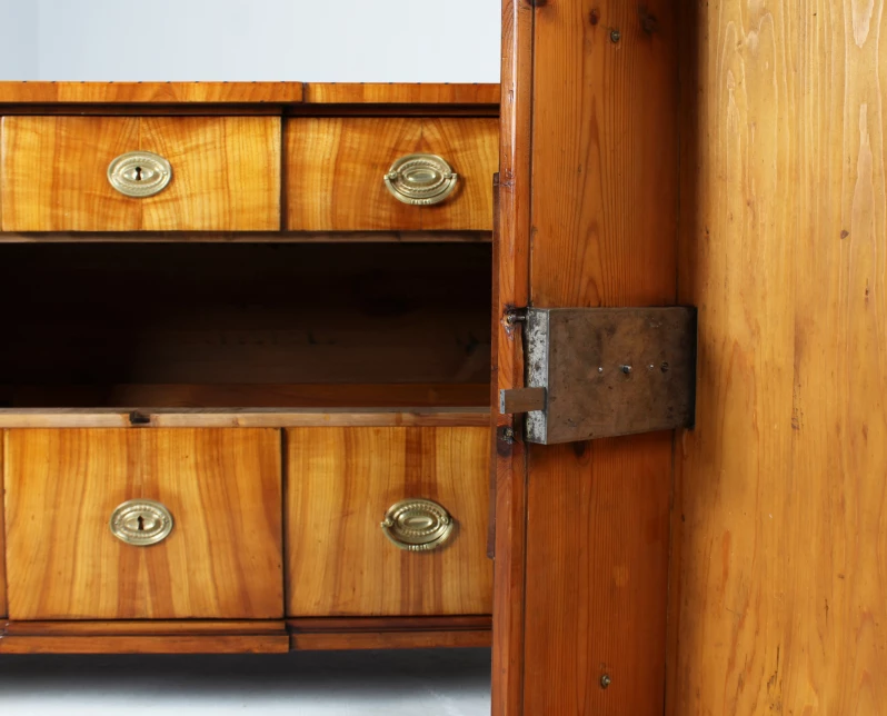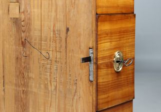 Un point fort particulier de la commode est la serrure à palastre située dans le tiroir central, qui permet de fermer les trois tiroirs. Équipée de deux verrous, la serrure se ferme alternativement vers le haut et vers le bas à chaque fois que l'on tourne la clé, de sorte qu'après six tours, tous les tiroirs sont verrouillés. Un travail de forgeage impressionnant ! Veuillez regarder la vidéo à ce sujet.