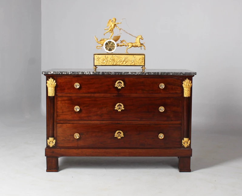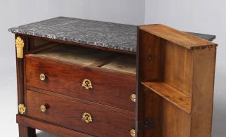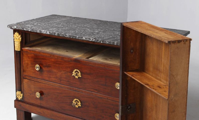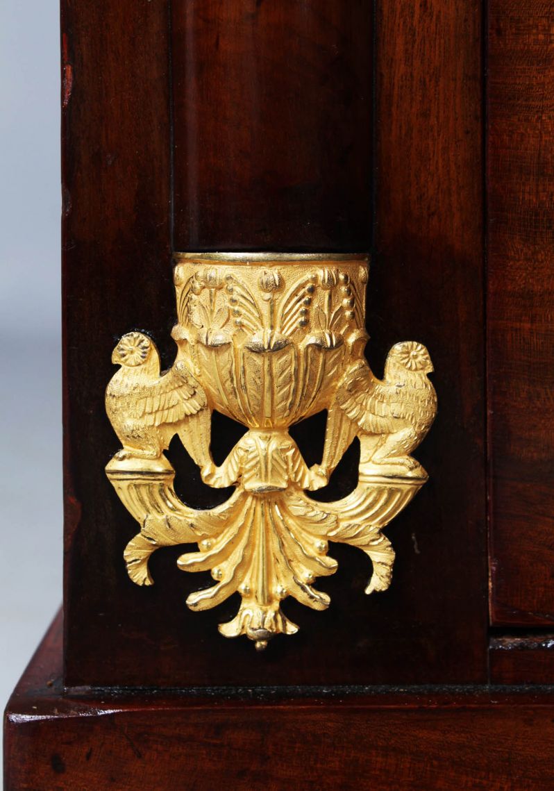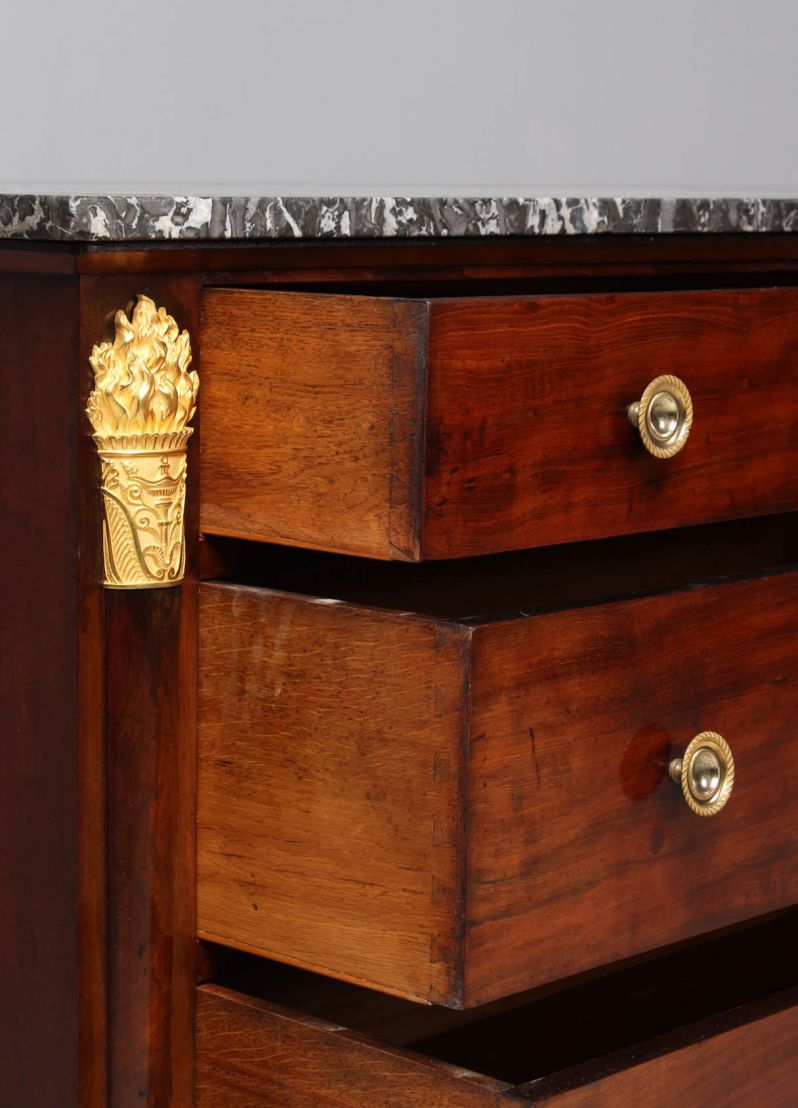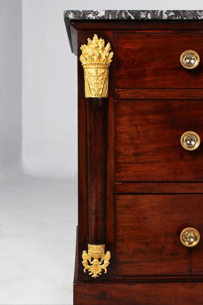 A gauche et à droite des tiroirs, nous voyons respectivement un flambeau dont la tige est en acajou massif. L'extrémité inférieure de la tige de la torche est entourée d'un hibou et de rinceaux en bronze finement coulé, ciselé et doré au feu.