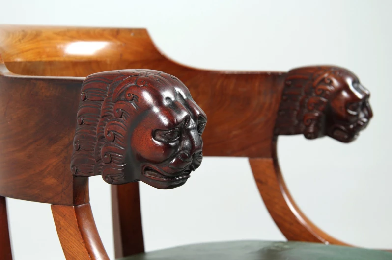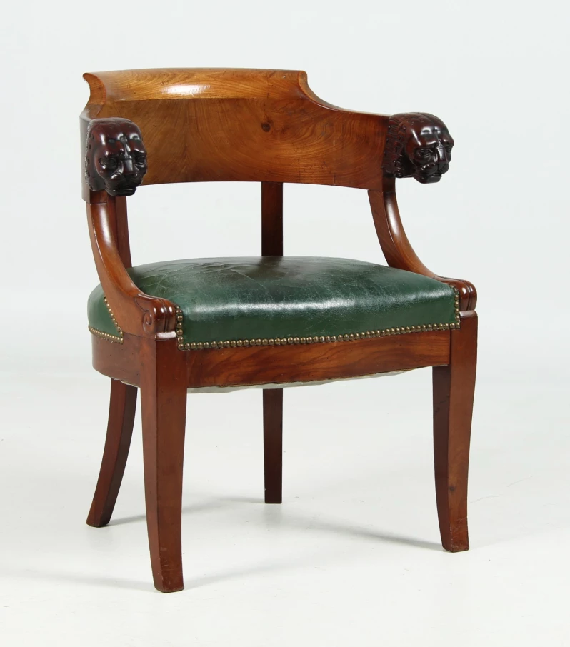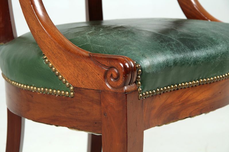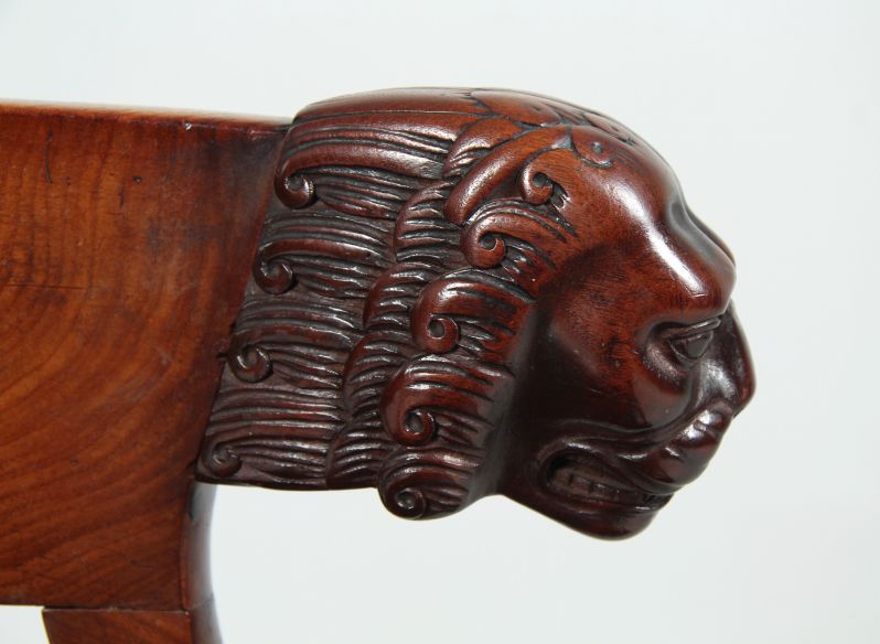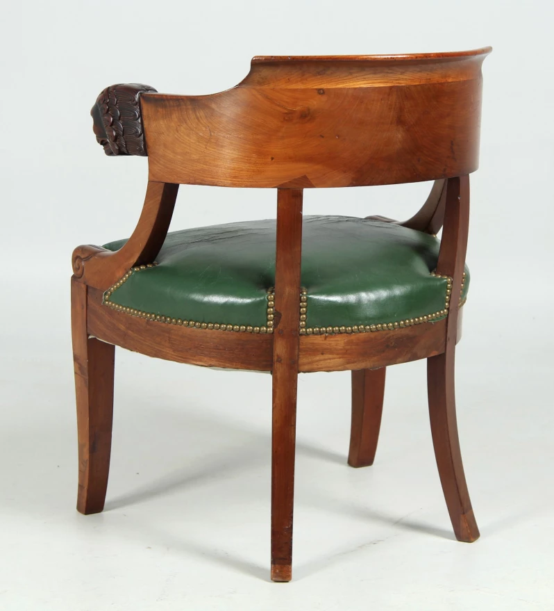 Des pieds carrés légèrement évasés en forme de sabre à l'avant et à l'arrière soutiennent l'assise rembourrée et recouverte de cuir vert. Un large dossier, plaqué d'acajou sélectionné et décoré de poignées sculptées en forme de têtes de lion, suit la forme en demi-cercle du cadre. Les clous en laiton doré du rembourrage enrichissent le jeu de couleurs des tons rouges changeants du bois d'acajou avec le revêtement en cuir vert mousse de l'assise.
