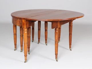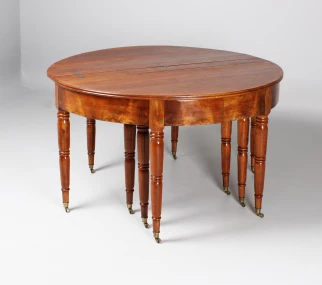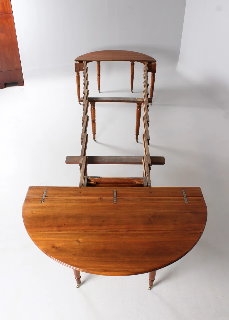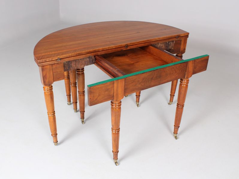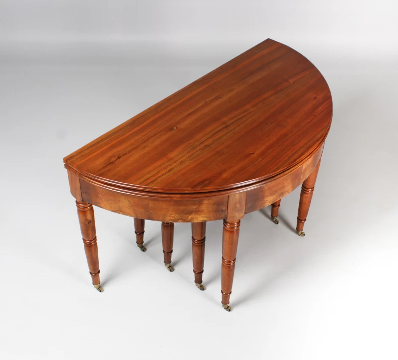 Une fois repliée, nous voyons une console Demi Lune avec un total de dix pieds discrètement tournés en sabots de laiton avec roulettes. La console a une largeur de 135 cm et une profondeur de 68 cm.