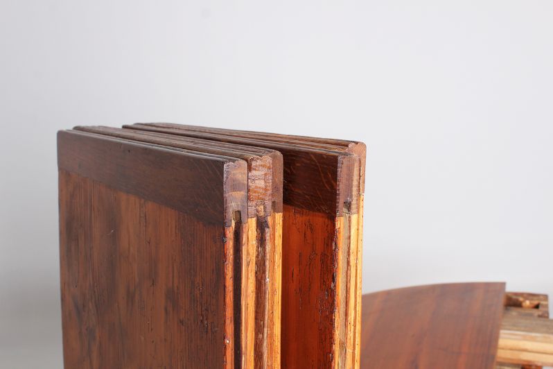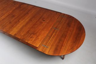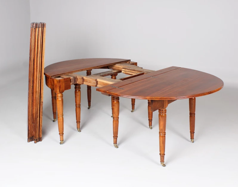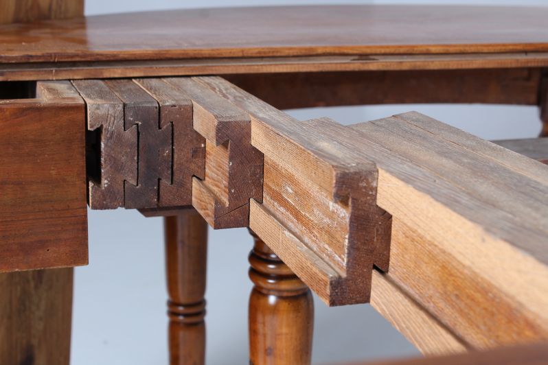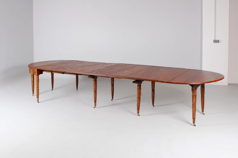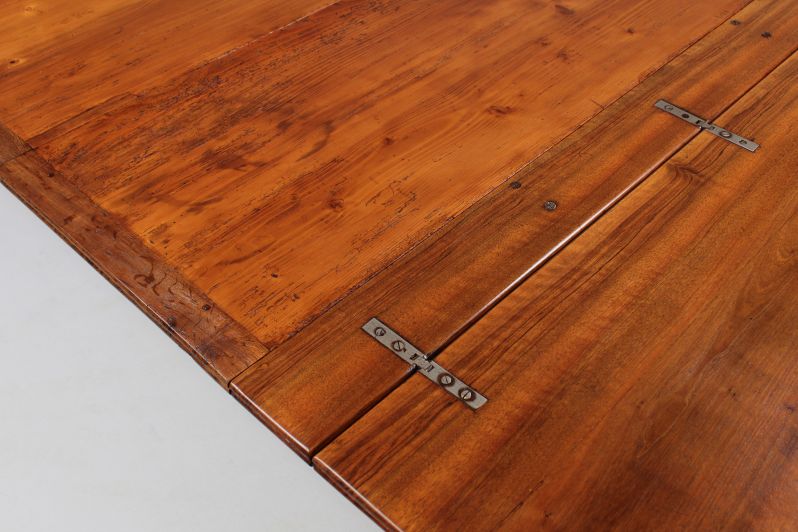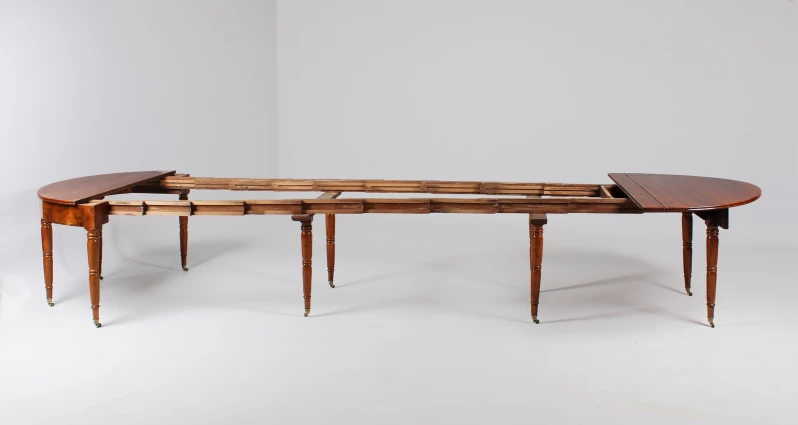 La table peut maintenant être déployée grâce à un système de coulisses, c'est-à-dire un système de tiroirs en bois qui s'emboîtent les uns dans les autres. Il y a six planches originales qui permettent de rallonger la table d'environ 45 cm chacune. On obtient ainsi une longueur totale de 407 cm.