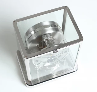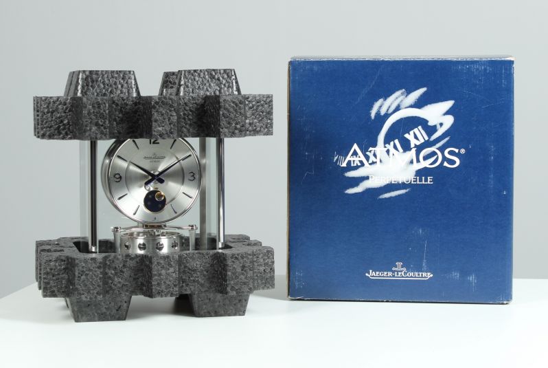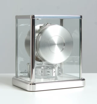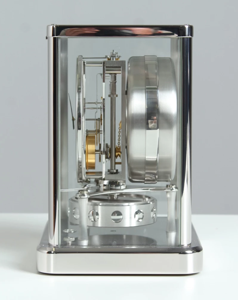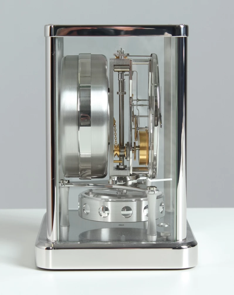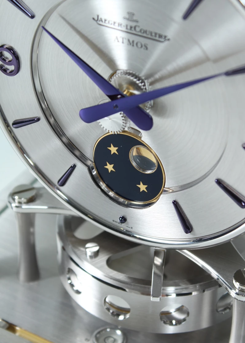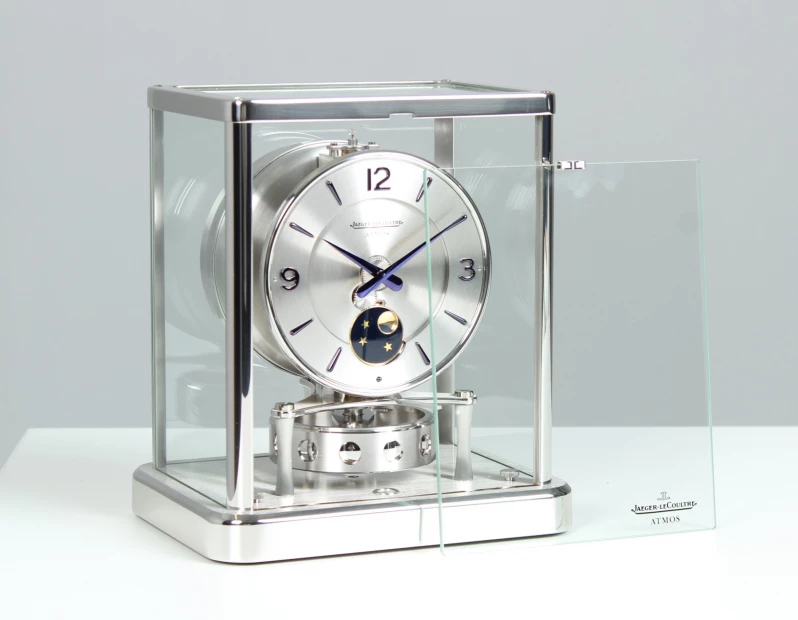 Calibre Atmos 540 avec phase de lune dans un boîtier rhodié.
