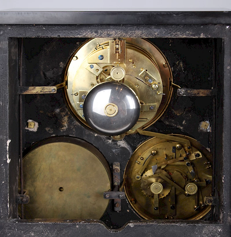 Entre les deux, le cadran est doté de chiffres romains, d'aiguilles Breguet, d'une seconde centrale et d'un échappement Brocot visible. Le cadran est signé : Aubert & Klaftenberger GENEVE. Dans l'anneau extérieur du cadran, nous trouvons deux petites goupilles carrées, celle au-dessus de la XII sert à régler la vitesse, celle en dessous de la VI sert à régler l'heure.