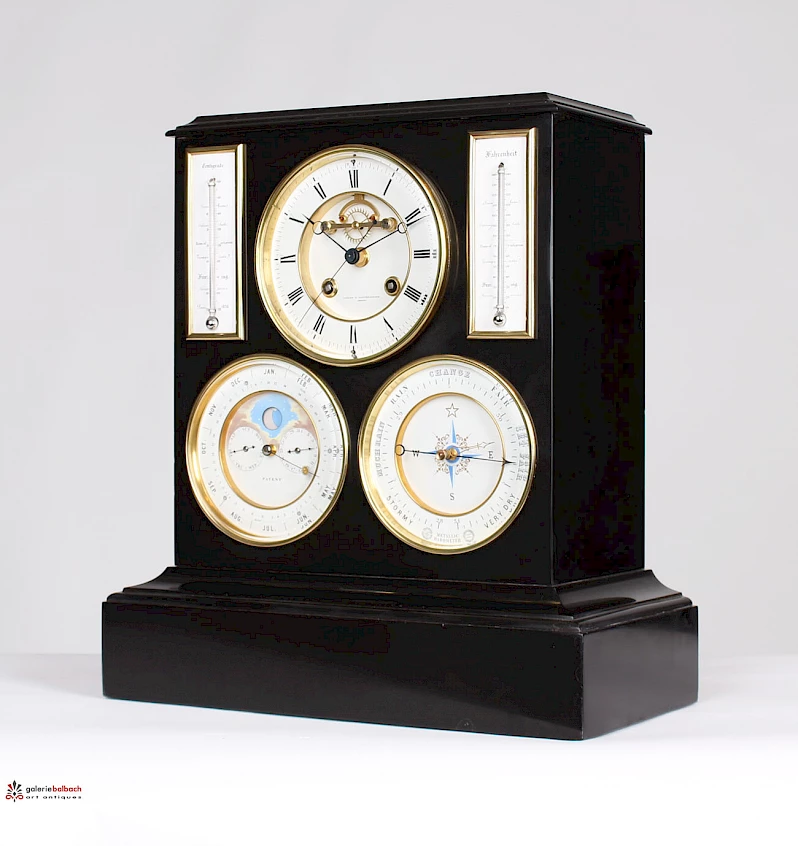 En bas à droite se trouve un baromètre avec une rose des vents centrale.