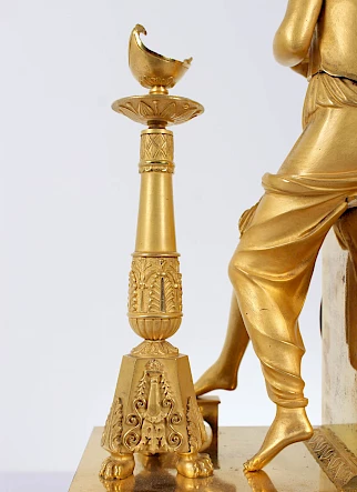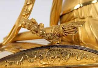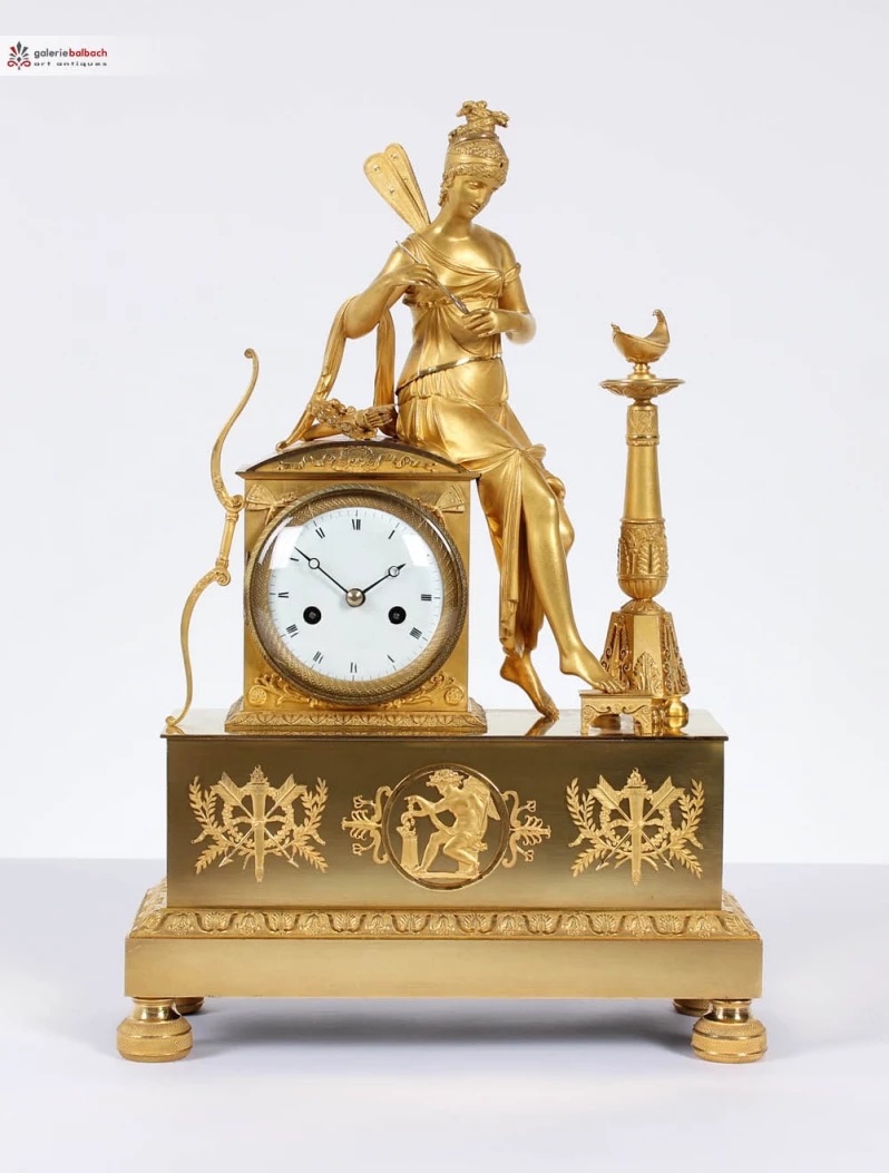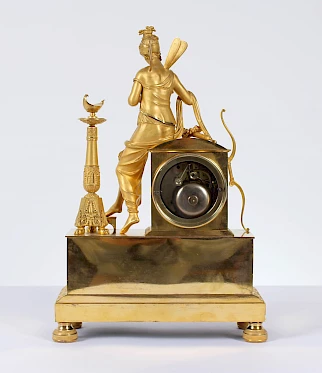 A droite de la figure se trouve un tripode finement conçu sur des pattes de lion avec de fines frises et applications. Au-dessus, une petite coupe. En haut du boîtier de la montre, nous voyons un carquois et une couronne de laurier. À gauche, un arc s'appuie sur le boîtier.