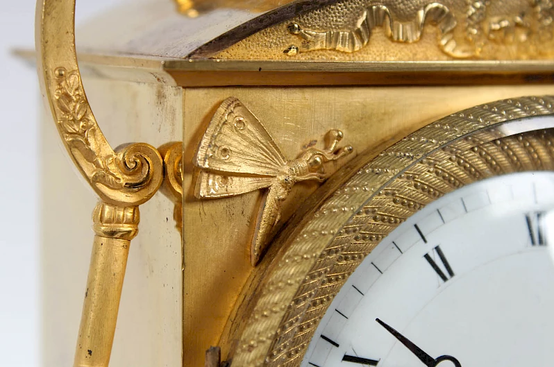 Le boîtier lui-même est décoré avec art de papillons et de rinceaux d'acanthe qui entourent le cadran émaillé blanc.