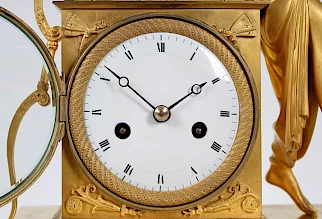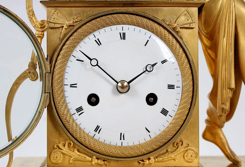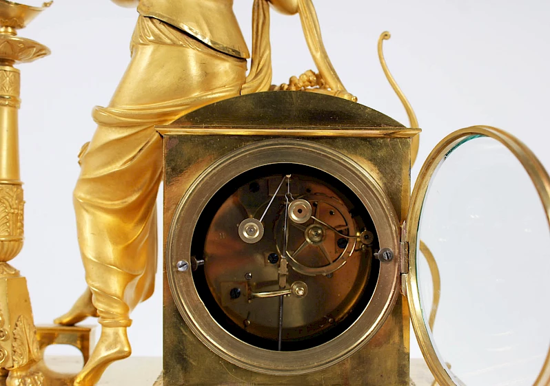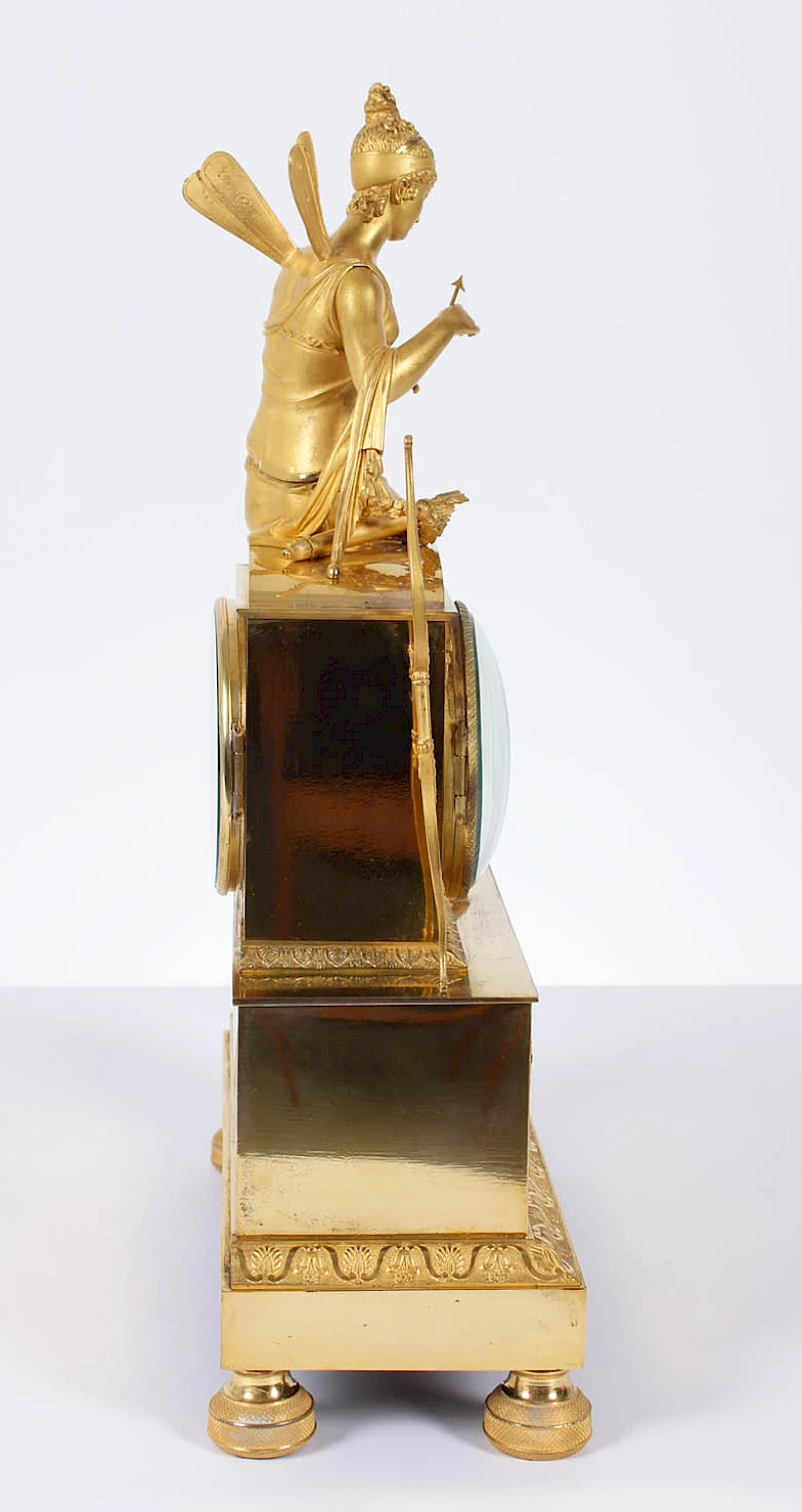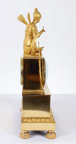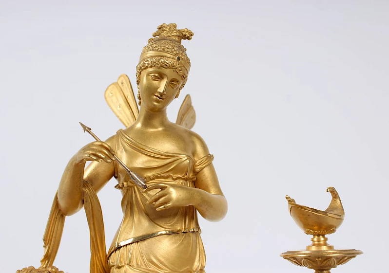 La figure principale - d'une très belle qualité de bronze - est Psyché aux ailes de papillon, assise dans une pose détendue sur le boîtier du mouvement. Elle est vêtue d'une tunique qui enveloppe son corps avec souplesse ; le drapé laisse deviner la légèreté du tissu. Ses cheveux sont relevés de manière complexe. Elle tient une flèche dans les mains et pose son pied droit sur un petit tabouret.