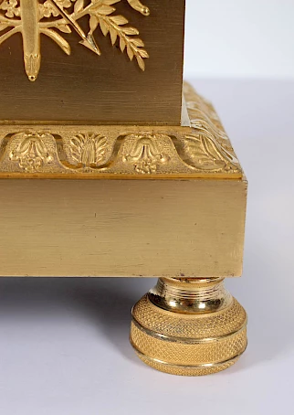 Socle reposant sur des pieds ronds finement ciselés et orné d'une frise de fleurs et de palmettes. Des bas-reliefs appliqués représentent des flèches, un flambeau et une couronne de laurier.