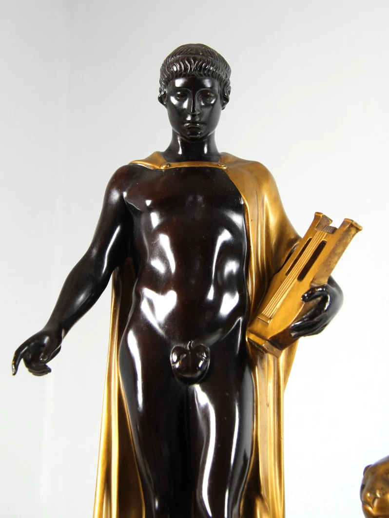 L'attention se porte sur le groupe de personnages en bronze doré et patiné.