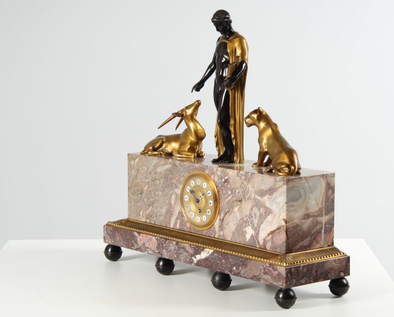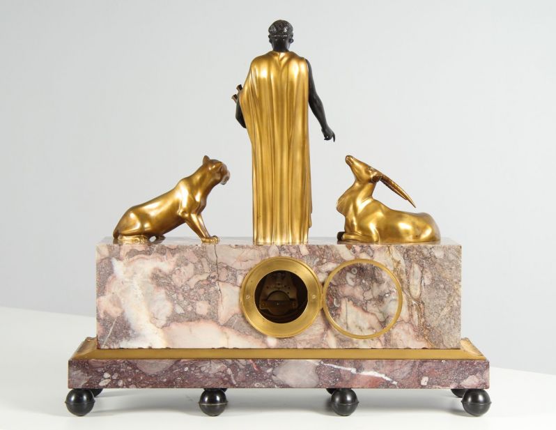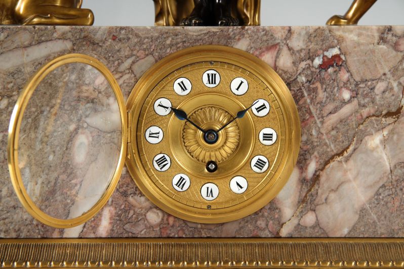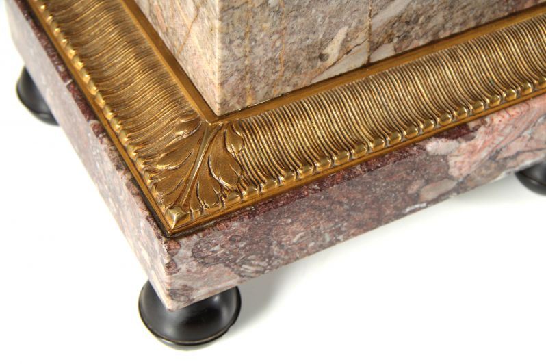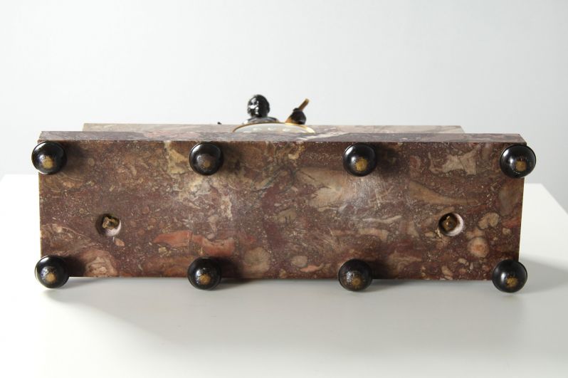Le socle évasé, posé sur huit pieds sphériques, supporte le bloc de marbre massif dans lequel est encastré le mouvement. Encastrées dans une plaque de laiton guillochée et dorée, les cartouches émaillées avec des chiffres noirs sur fond blanc assurent une bonne lisibilité de l'heure.