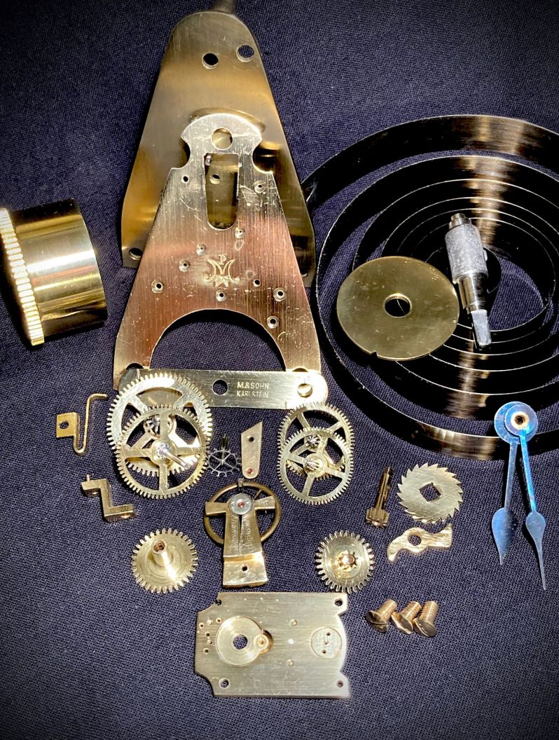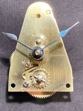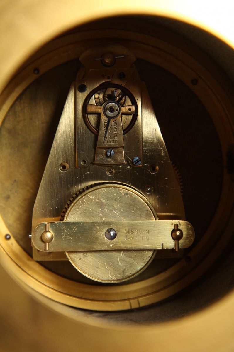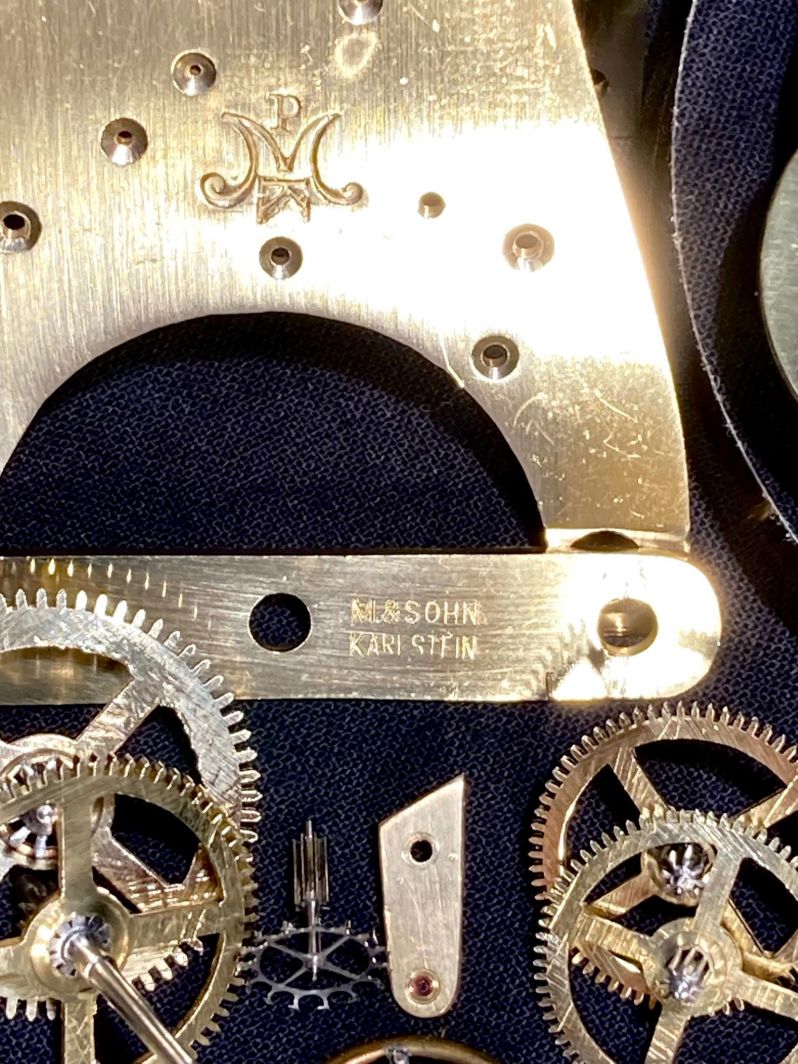 Le mouvement d'horlogerie à échafaudage, accessible par l'arrière et protégé de la poussière par une porte vitrée, a été réalisé par Mühlhauser & Sohn de Karlstein. Josef Mühlhauser fabriquait déjà des mouvements pour régulateurs et horloges domestiques à partir de 1882. À partir de 1883, Franz Pleskot a rejoint l'entreprise et une entreprise de type manufacture a été mise en place, employant environ 40 personnes. Après la mort de Pleskot en 1905, Josef Mühlhauser jun. entra dans l'entreprise et l'on compléta le poinçon original PMK par l'inscription M&Sohn Karlstein.