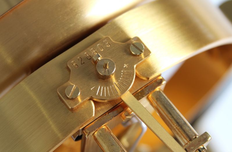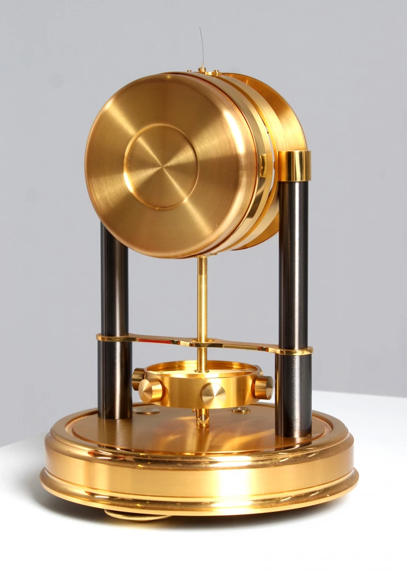 Le mouvement de la montre se distingue par sa boîte cylindrique à l'arrière. A l'intérieur, une chambre d'expansion en forme de soufflet contient un gaz saturé, le chloroéthyle. Dans des conditions de pression déterminées, les variations de température entraînent une forte modification du rapport entre le liquide et le gaz et, par conséquent, de la pression dans la chambre d'expansion. Une variation de température de 1°C déplace le fond du soufflet d'environ un millimètre et exerce ainsi une pression sur un ressort situé dans le soufflet. La chaîne montée sur le ressort transmet la force au mouvement et fournit ainsi l'énergie nécessaire pour une durée de marche d'environ 48 heures. Cet intéressant mécanisme de remontage est complété par un excellent mouvement d'une précision extrême. Le lourd balancier à torsion, avec ses six vis de réglage caractéristiques, rappelle également les débuts de la montre Atmos dans les années 1920 et 1930.