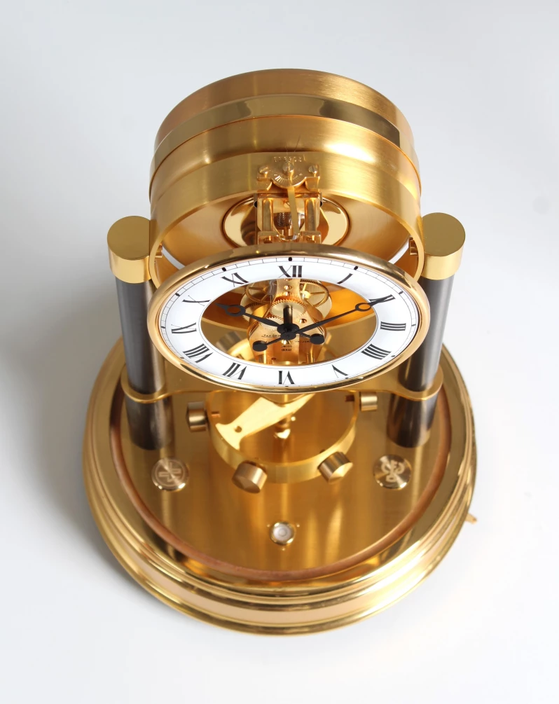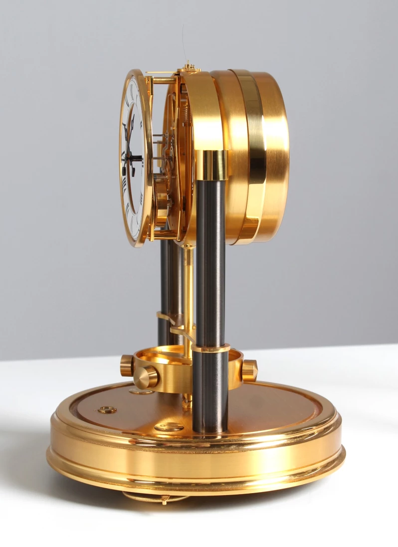 Inspirée du premier prototype de l'ATMOS 0 présenté en 1927 (voir photo), la montre repose sur un socle rond en laiton et est protégée de la poussière par un dôme en verre soufflé à la bouche.