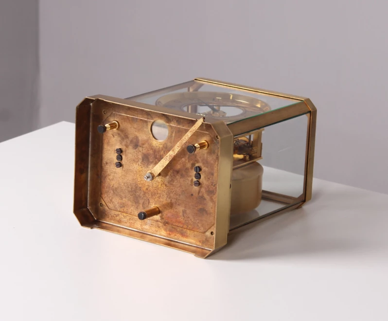 Les premières montres Atmos, dont celle-ci, avaient encore des boîtes à pression avec des soudures. C'est pourquoi, à partir de 1947, on a fabriqué des boîtes à pression en acier plié qui ont permis de résoudre le problème des fuites. Sur la montre proposée ici, l'ancienne boîte à pression soudée a été remplacée par une nouvelle.