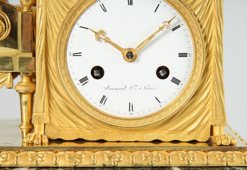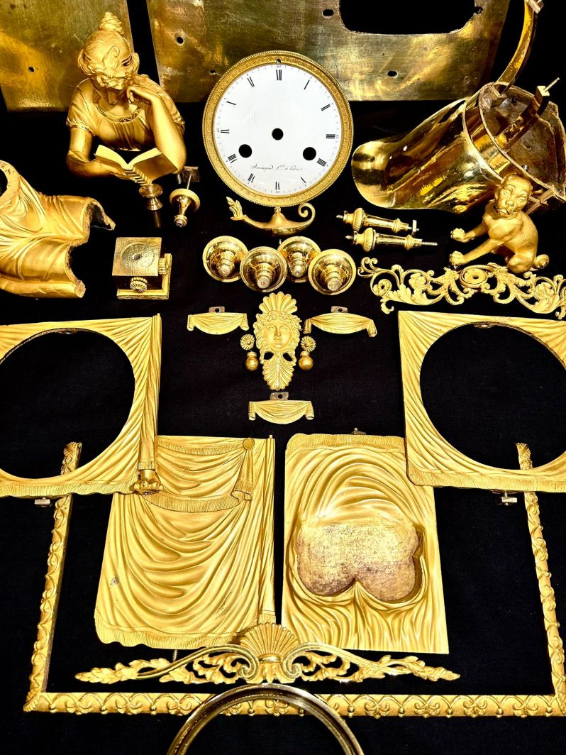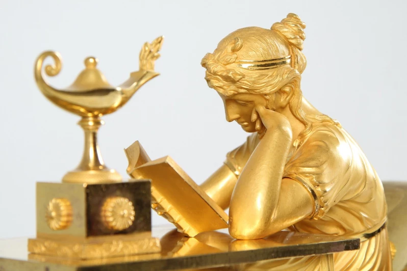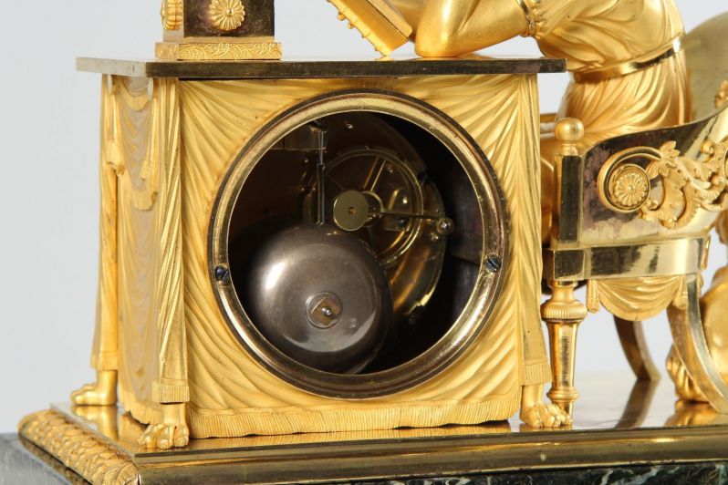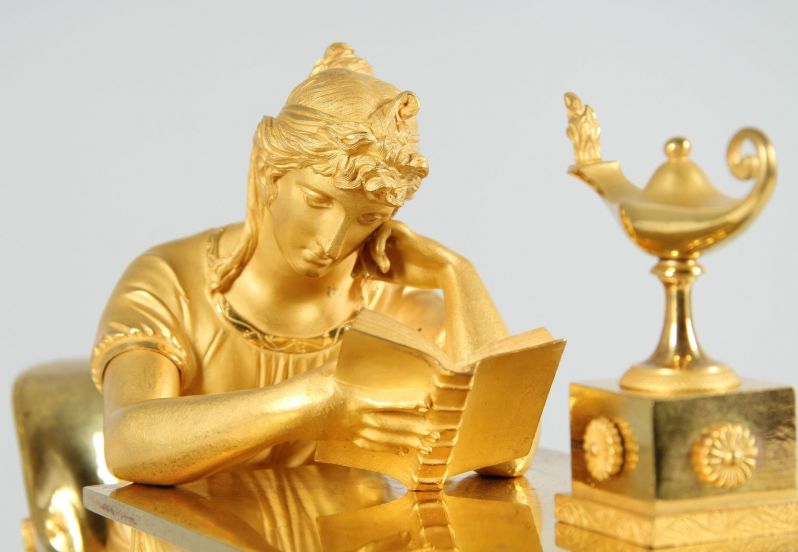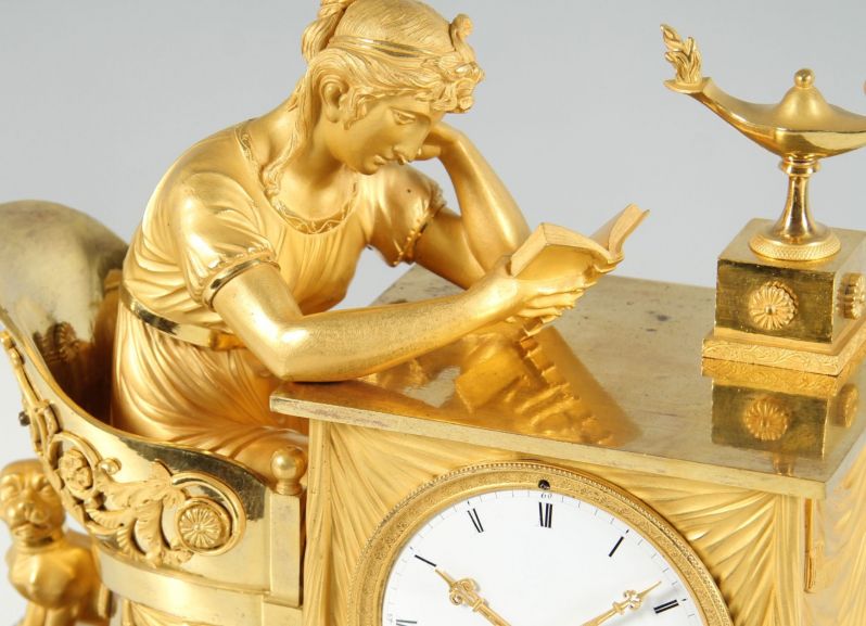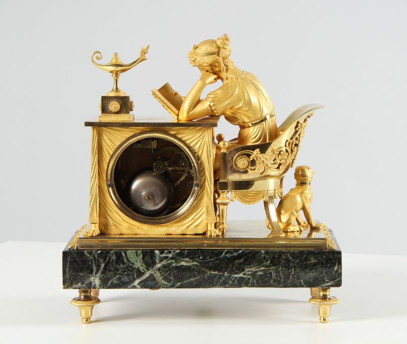 Cette horloge témoigne du grand savoir-faire artisanal des fondeurs de bronze, ciseleurs et doreurs parisiens au début du 19e siècle. Les traits du visage de l'étudiante semblent concentrés, la coiffure relevée est finement modelée. Le drapé de sa robe et de la nappe semble également absolument réaliste.