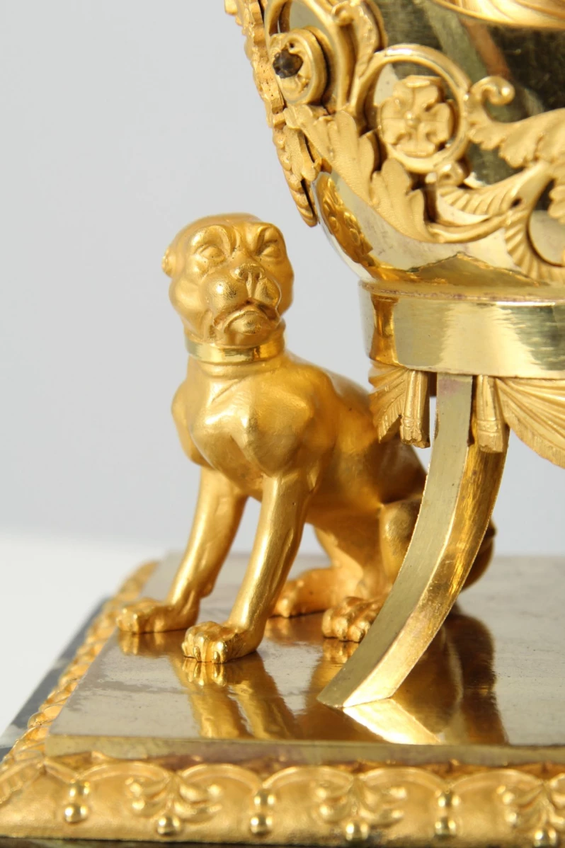 Derrière le fauteuil, assis - et c'est ce qui distingue cette horloge de nombreux modèles comparables - se trouve un bouledogue anglais. Les toutous et les races élevées de manière ciblée étaient déjà répandus dans les cours européennes aux 17e et 18e siècles. Au début du 19e siècle, ils ont également fait leur entrée dans les foyers bourgeois. Dans le contexte iconographique de cette horloge, le chien peut être compris comme un symbole de fidélité et de domesticité.