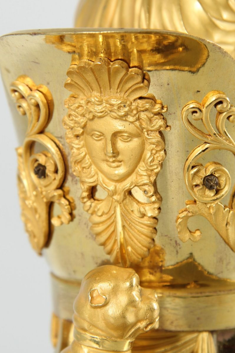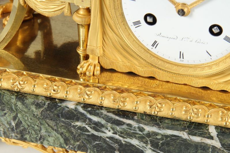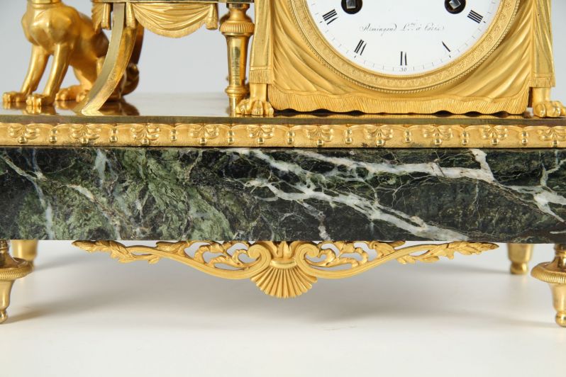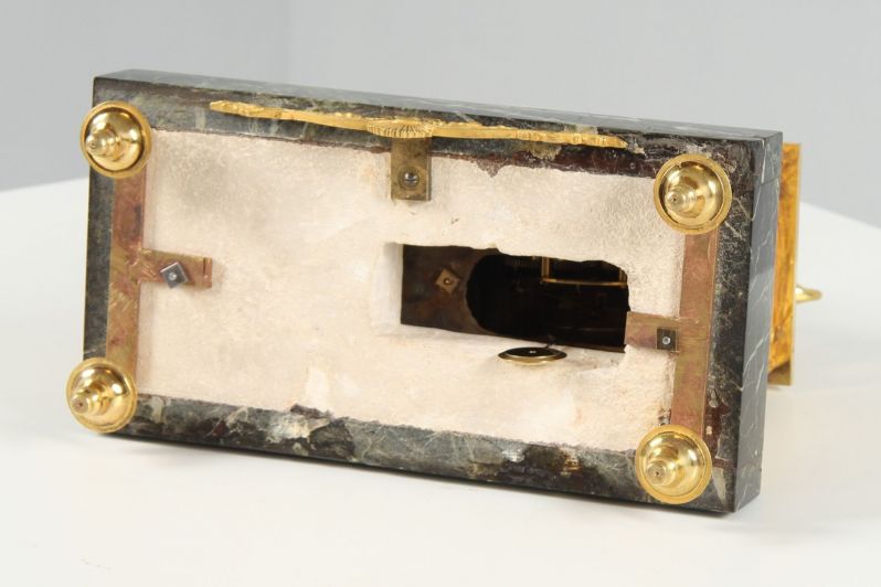 L'horloge repose sur des pieds en forme de balustres finement torsadés en bronze doré à chaud. Sous le socle en marbre se trouve une tenture en bronze ajourée avec un motif central de coquilles et des rinceaux s'étendant sur les côtés.