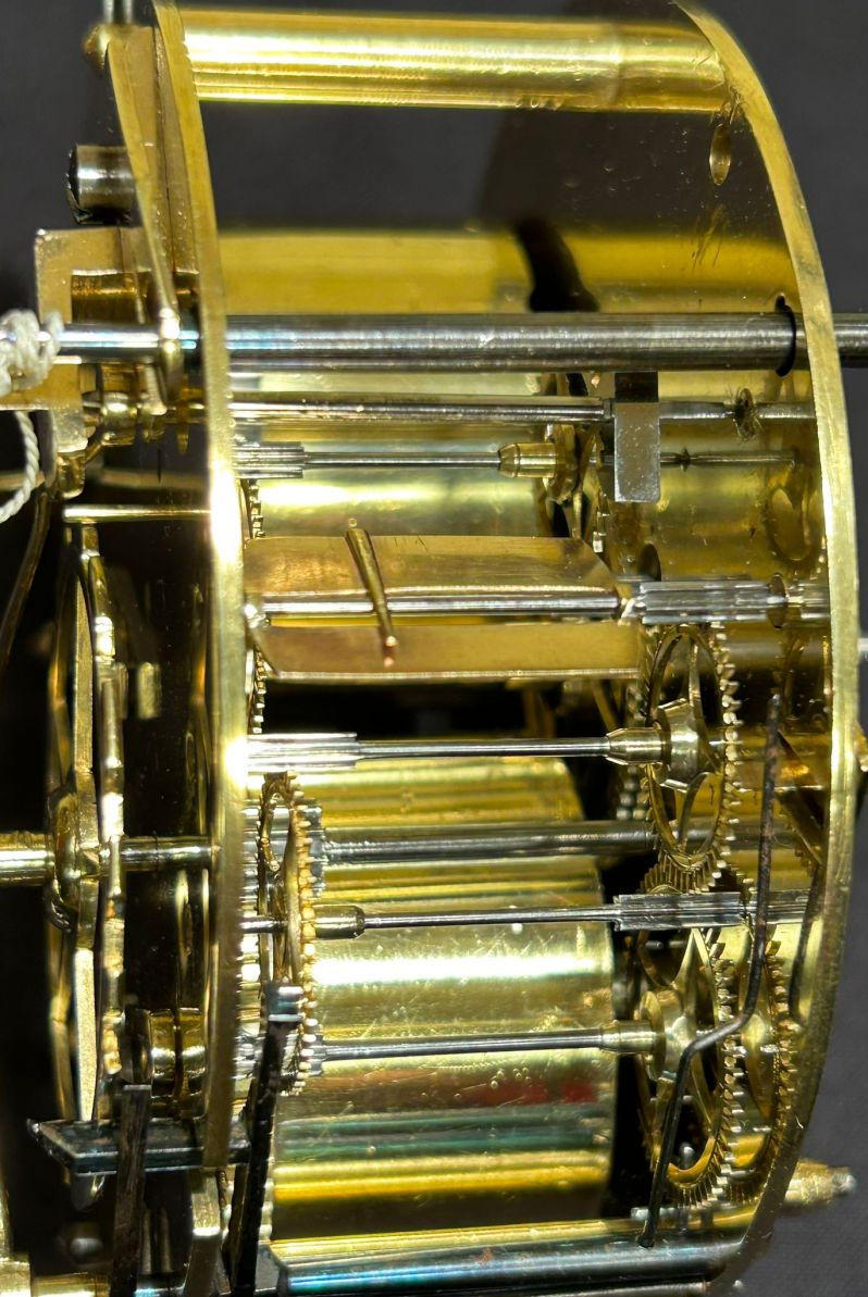 Le mouvement est un mouvement de pendule français d'une durée de marche d'une semaine. Le pendule est suspendu à un fil, comme il est d'usage à l'époque. Le réglage de la vitesse de marche se fait par un petit carré situé au-dessus du 12 du cadran. La sonnerie à disques de serrure sonne à la demi-heure et à l'heure.