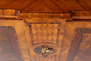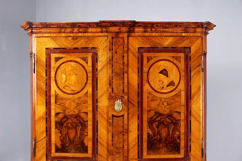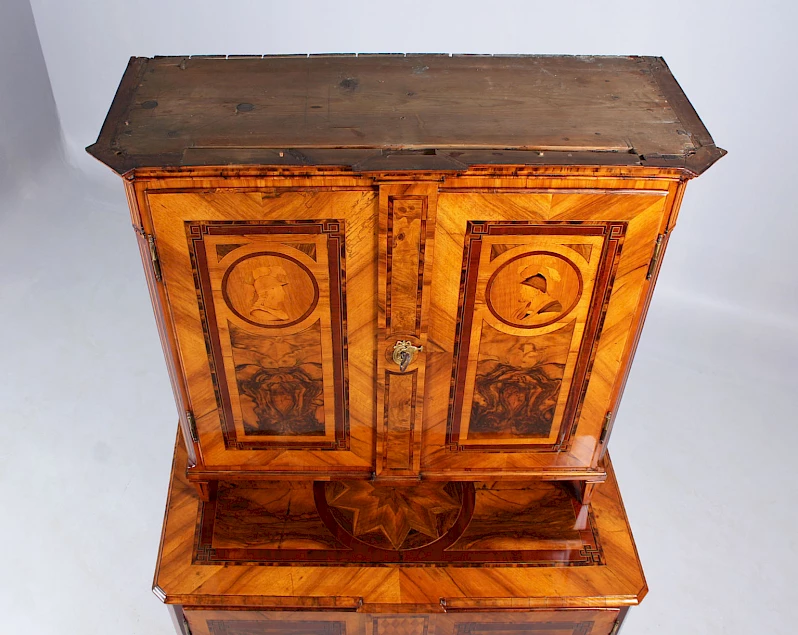 Les corps sont fabriqués en bois tendre et plaqués en noyer, bois de racine et autres bois précieux. Les deux parties du meuble ont des portes suspendues à des charnières et un intérieur sobre.