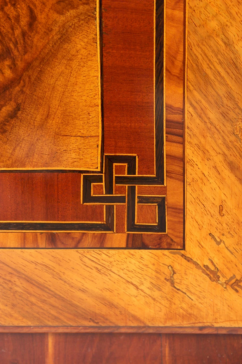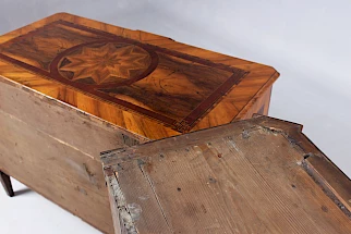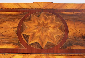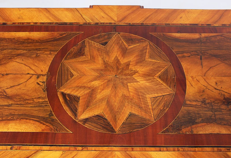 Le bord du plateau supérieur est en bois massif. Des placages en forme d'étoile décorent la surface.