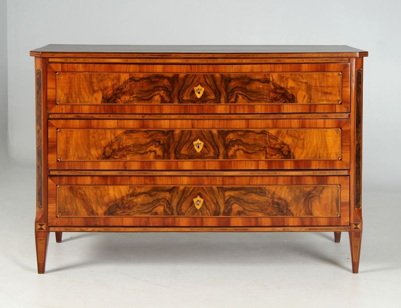 La façade du meuble est structurée par les trois tiroirs. Le prunier constitue le cadre extérieur des façades de tiroirs, suivi de quatre bandes étroites en chêne des marais, érable, acajou et à nouveau érable. Le placage de noyer dans le champ ainsi encadré est posé de manière symétrique et contrasté par les plaques de clés claires en forme d'armoiries, qui ont remplacé le conseil décoratif en bronze précédent lors d'une restauration plus ancienne.