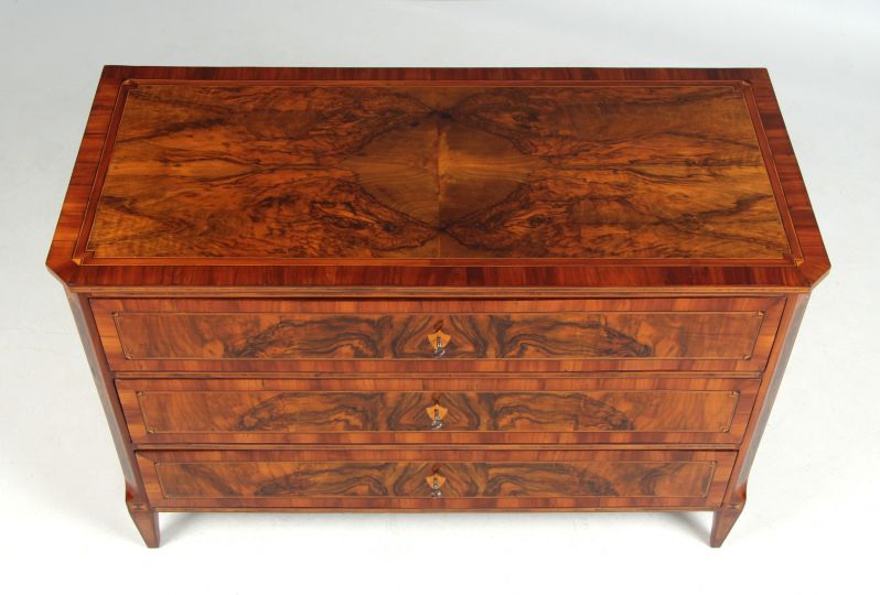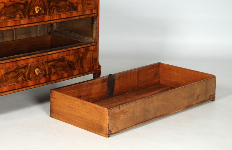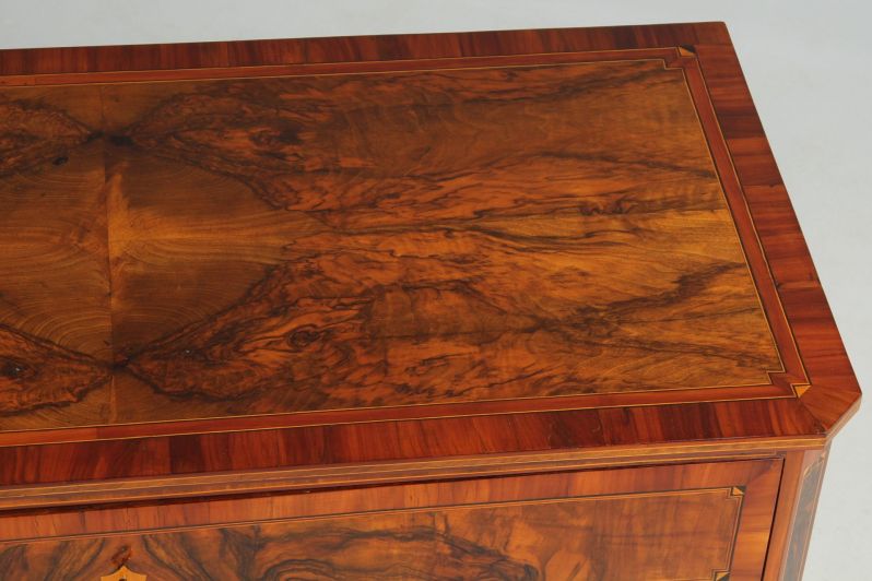 La commode proposée ici s'intègre également bien dans cette série, tant sur le plan formel que technique. Les différents éléments sont structurés en surfaces géométriques et séparés les uns des autres par de fines bandes de filets. Les surfaces de placage réfléchies, en particulier sur le plateau supérieur, sont également typiques de l'époque et de la région. Toutes ces caractéristiques font des meubles à torsades de Dresde une variante à part entière au sein de la création de meubles allemande.