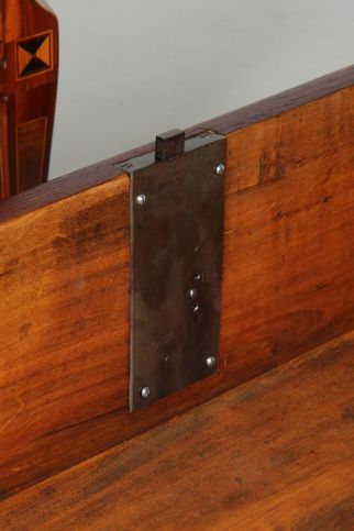 La plinthe, les traverses et le bord du plateau contribuent de manière décisive à la conception du meuble avec leur fine marqueterie.