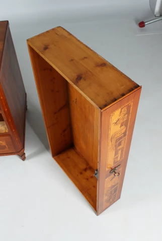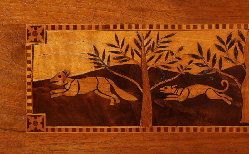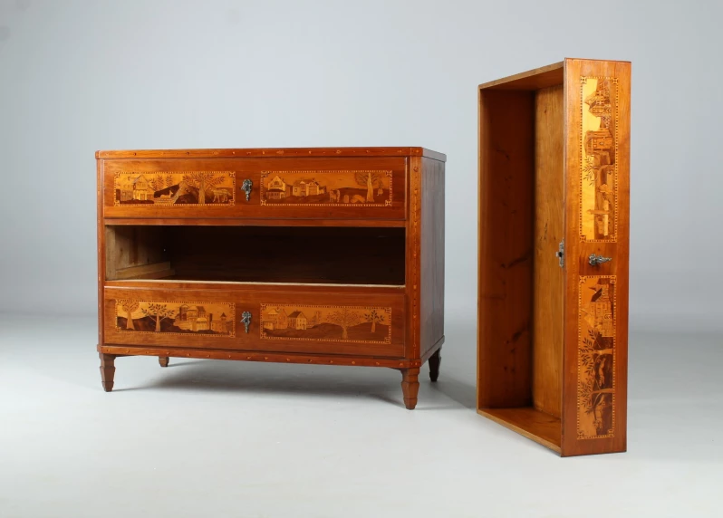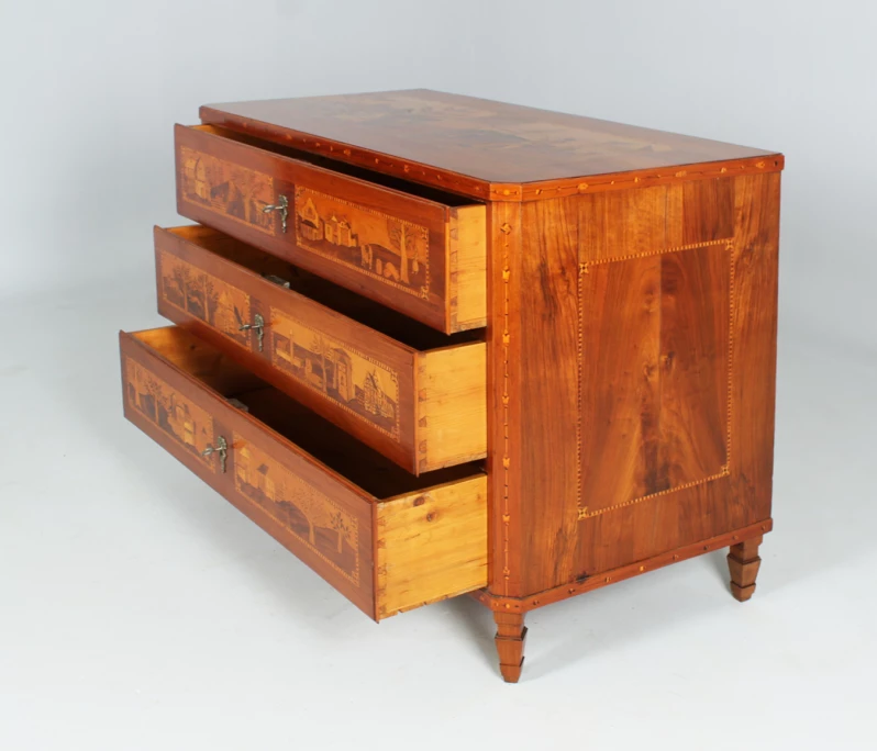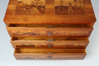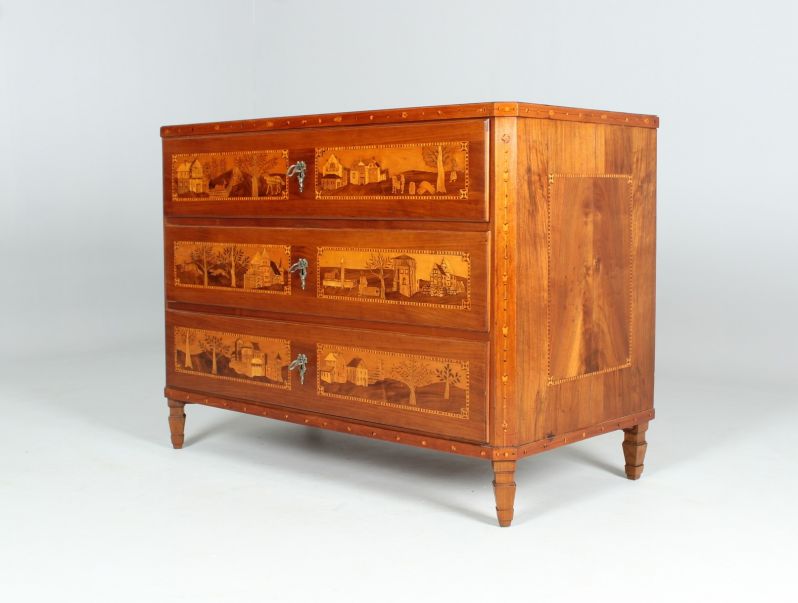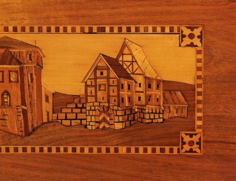Les façades des trois tiroirs sont divisées en deux champs par des bandes de filets contrastant en clair et en foncé. Différentes scènes de paysage et de chasse sont représentées dans un décor villageois des Alpes selon une technique de marqueterie très élaborée.
