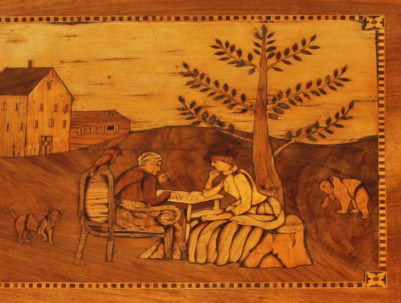 On le voit bien, par exemple, sur la photo de détail où l'on voit les deux dames jouer aux cartes. L'artisan d'il y a plus de 200 ans est parvenu à donner une tridimensionnalité aux jupes des dames en tisonnant puis en assemblant les morceaux de placage.