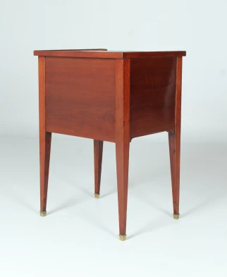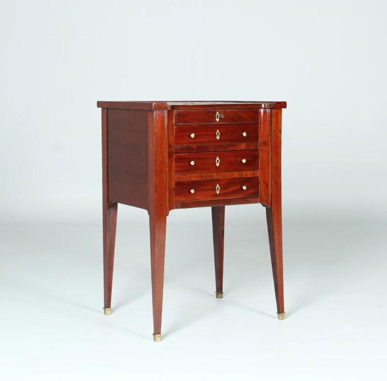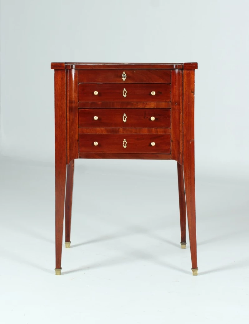Toutes les poignées et les ferrures sont en laiton, les pieds carrés coniques sont placés dans des sabots en laiton.