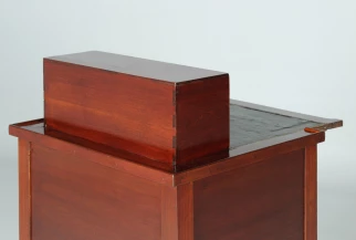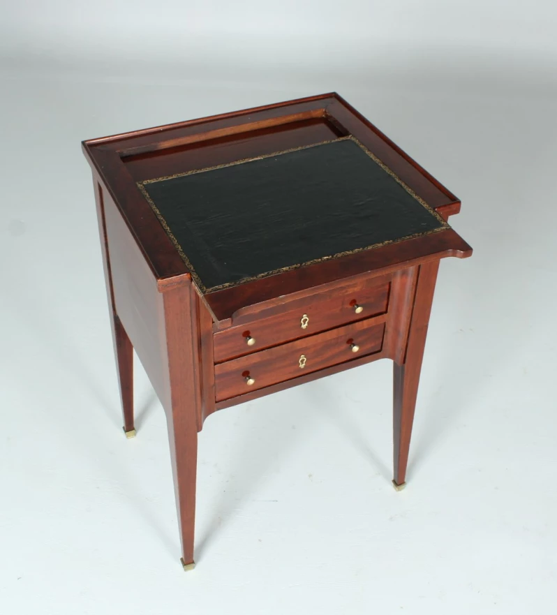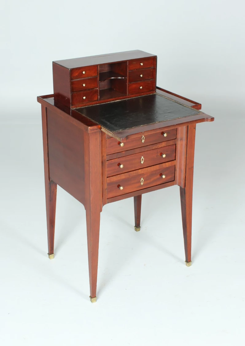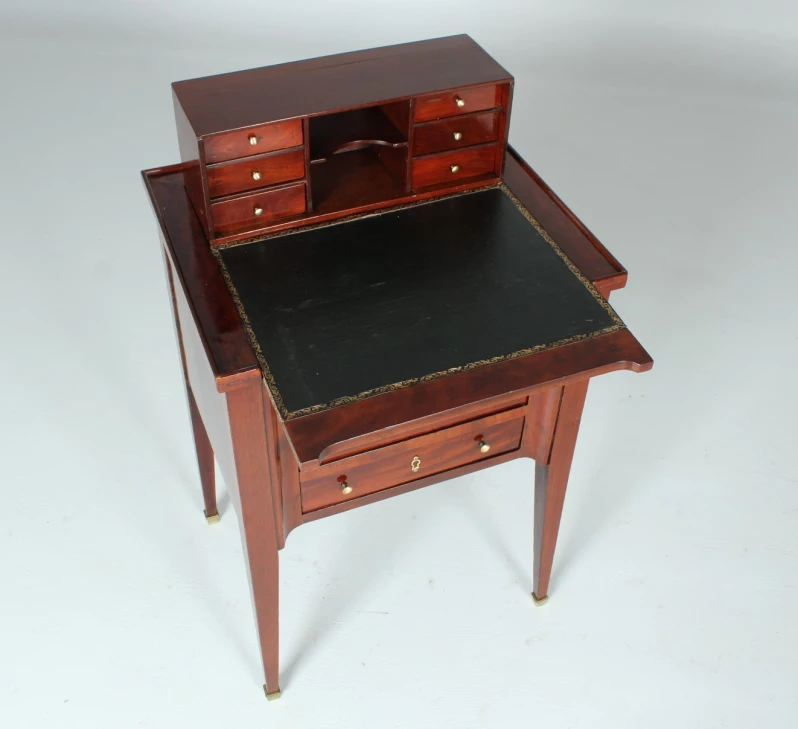 Le plateau en cuir peut être déplacé vers l'avant, ce qui fait monter automatiquement une partie secrétaire fixée à des câbles avec des poids.