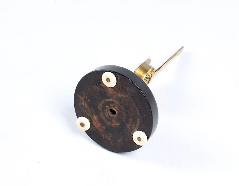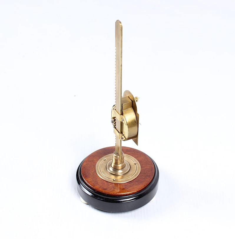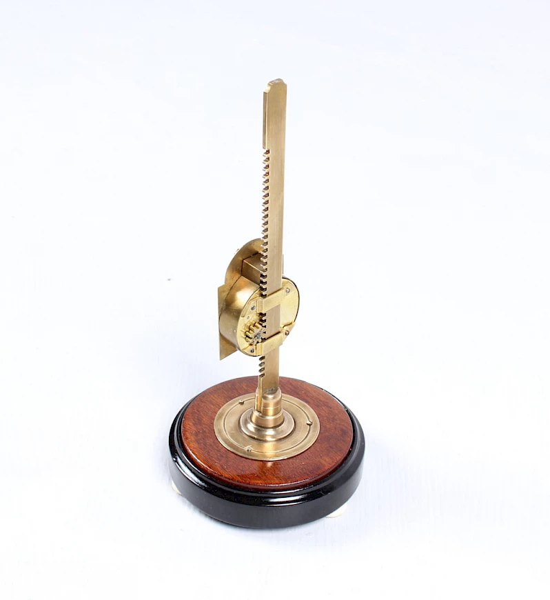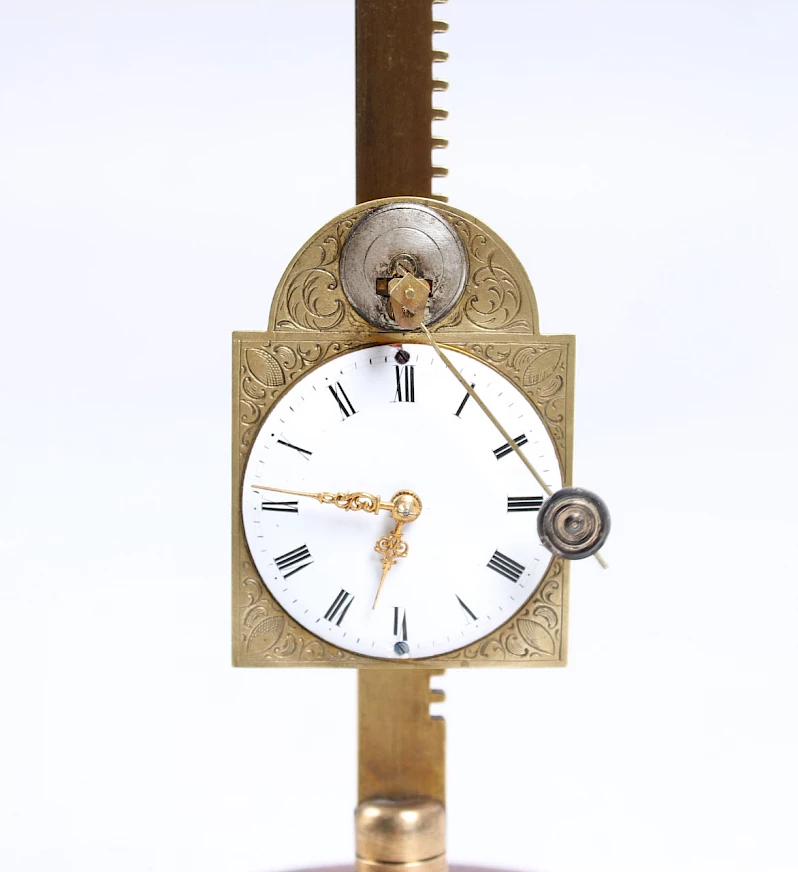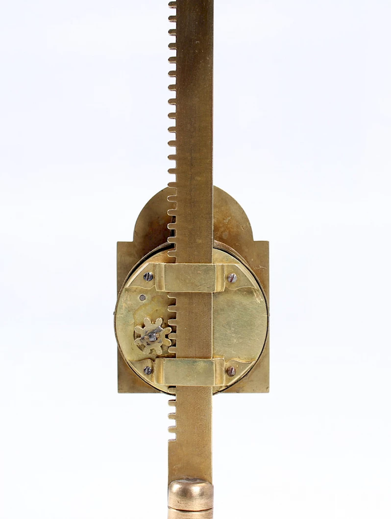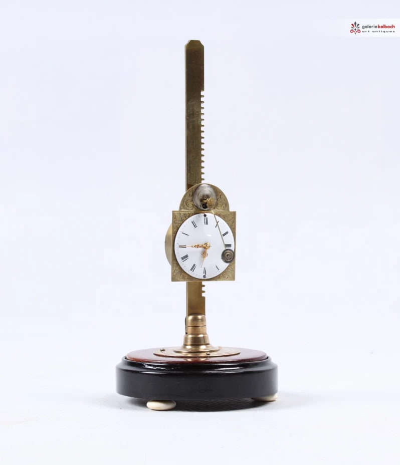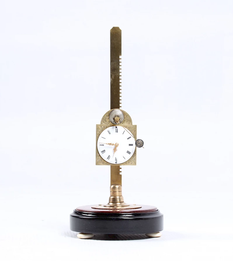 L'horloge proposée ici est toutefois une version rare de l'horloge à scie ascendante. Pour la remonter, elle doit être poussée vers le bas contre la tension d'un ressort. En l'espace de 24 heures, l'horloge grimpe lentement le long de la scie.