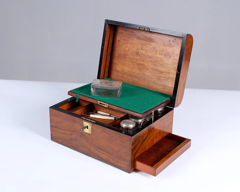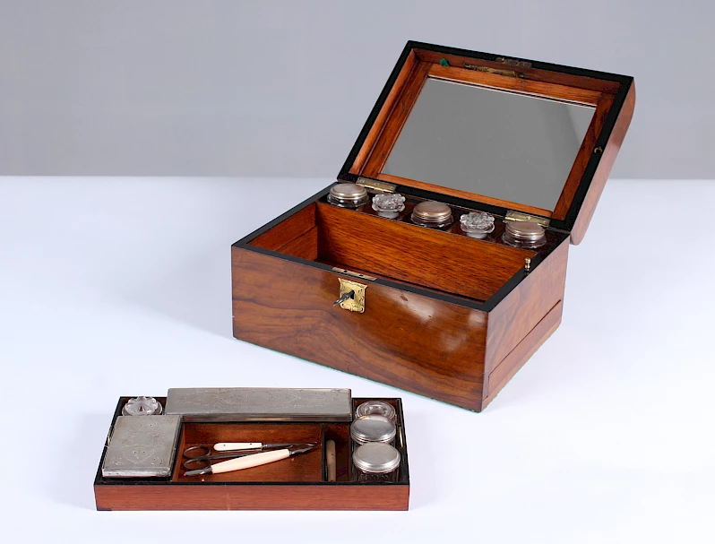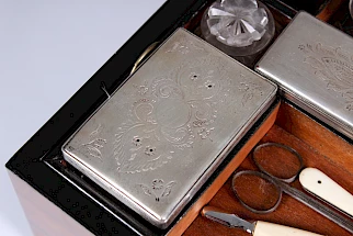 L'intérieur se compose de 9 petites boîtes et flacons de différentes tailles pour les crèmes, les parfums ou autres. Il y a également deux coffrets à couvercle. Tous les couvercles sont argentés, l'argenture des trois derniers est très usée.