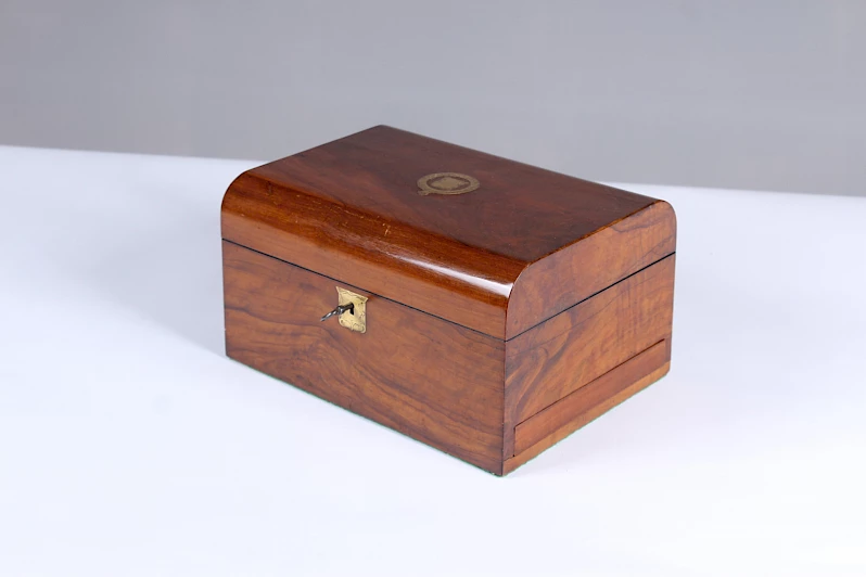 Coffret rectangulaire en noyer avec plaque de clé finement gravée et cartouche de couvercle en laiton.