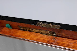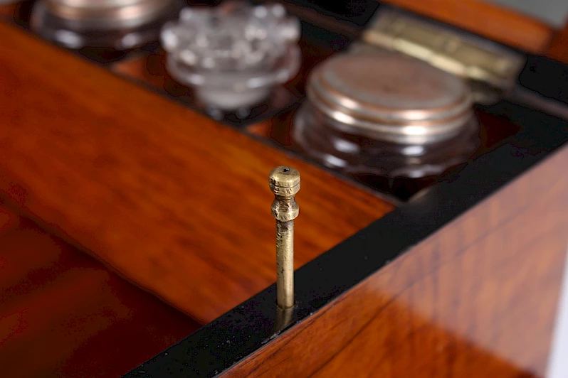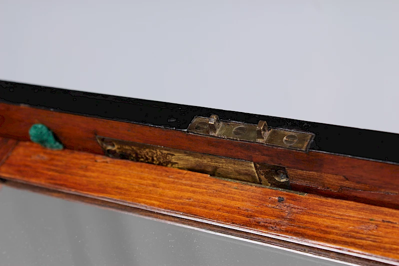 A l'intérieur, nous voyons dans le couvercle un miroir qui s'ouvre grâce à un mécanisme caché et qui donne ainsi un plan de travail recouvert de feutre.